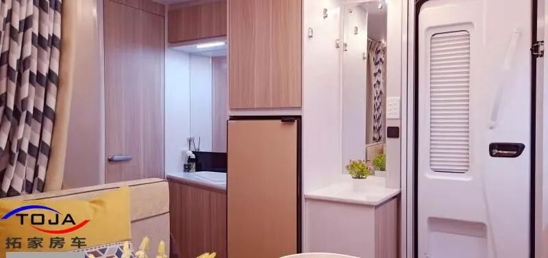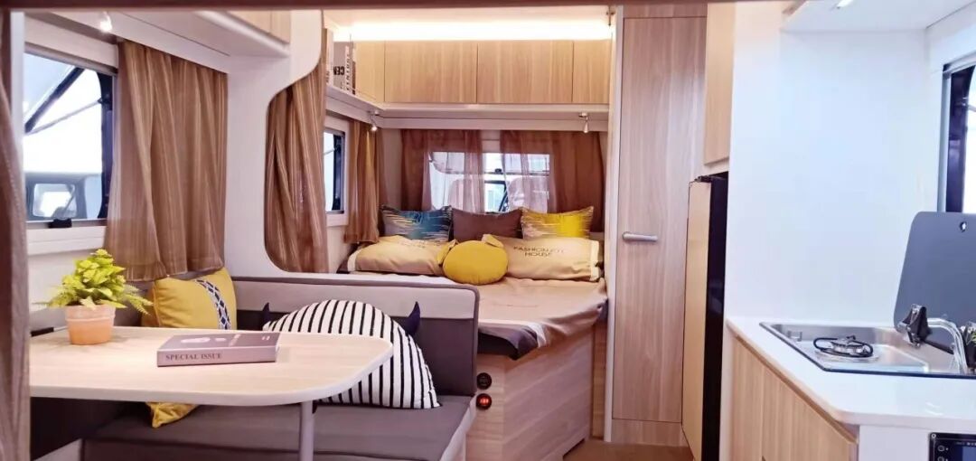 今天给大家介绍的是B款内饰布局,车内为原木风格,精致豪华,配置也很完善。会客区采用的是对座式沙发搭配可折叠餐桌的设计,驻车后还可拼成一张临时床铺以供休息。配有超大观景车窗,以及窗帘,保证室内采光的同时也能保护个人隐私。