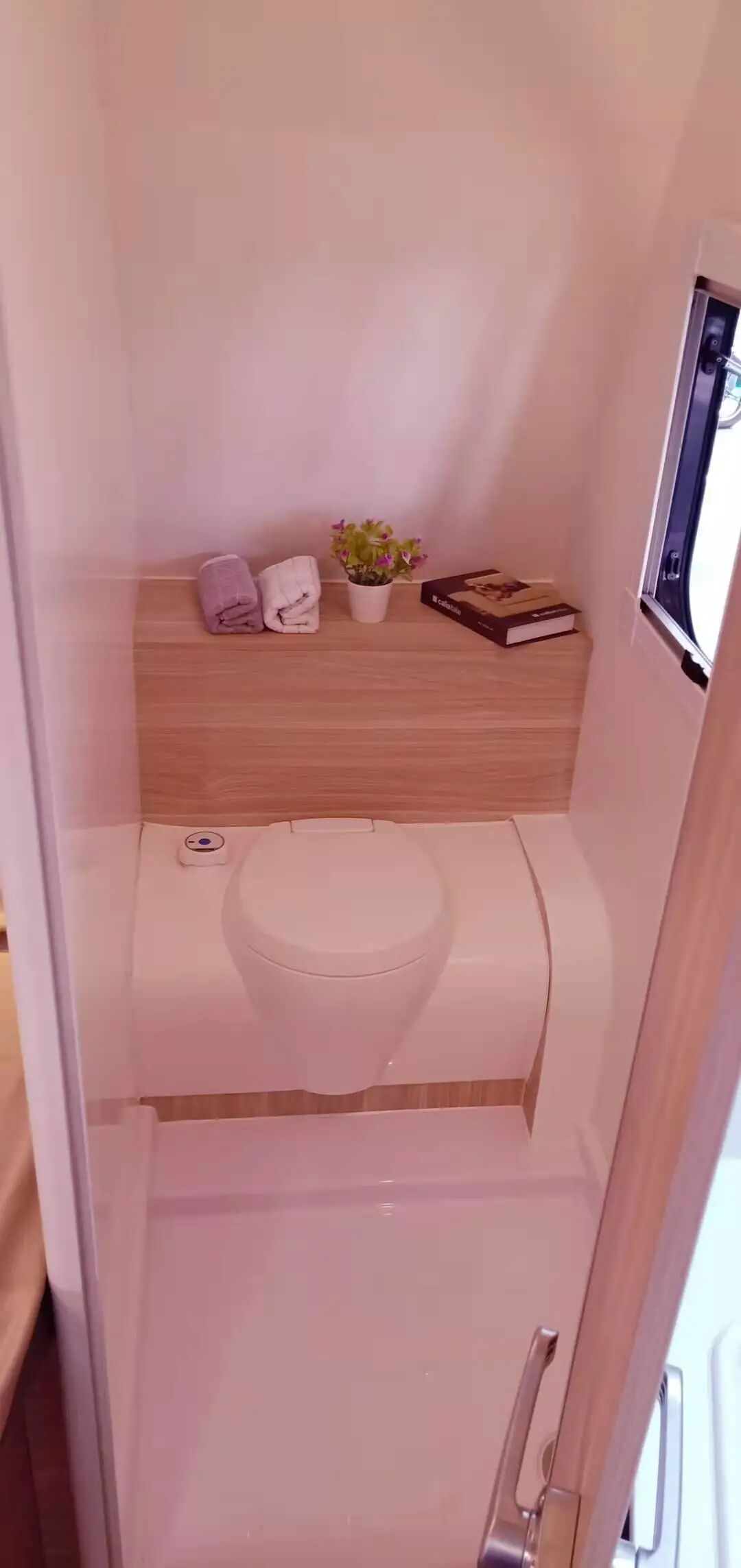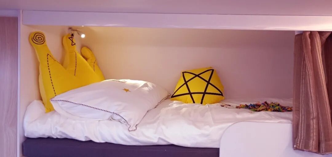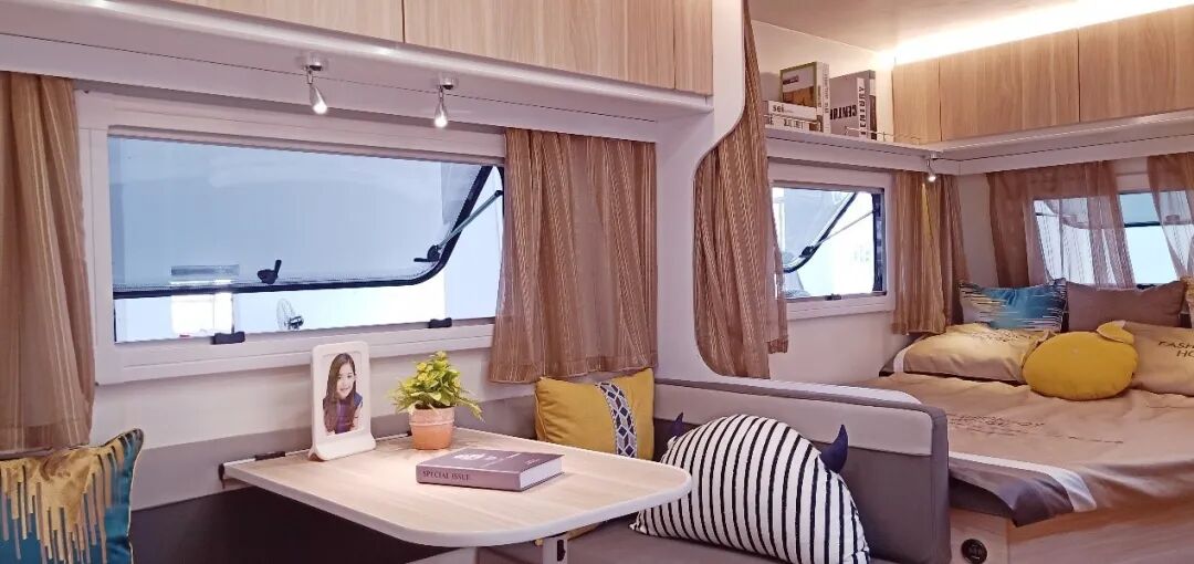 该车睡卧空间充足,分为车头的固定双人大床和车尾的上下铺。车头的固定双人床空间宽敞,可以满足两名成年人的睡卧需求。两面观景车窗视野开阔,保证了内部采光;上方是储物柜,可放置衣物等。