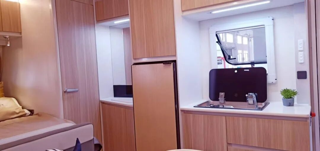 最后介绍的是厨房区,位于上车门左侧即房车尾部。厨房区布局较为简洁,配有翻盖式水槽、水龙头、外推窗、窗帘、照明灯、储物柜等,可满足基本的烹饪需求。上车门右侧还配有一台冰箱,可存放新鲜蔬菜;还配有一个小吧台,可放置水果、盆栽等小物品。