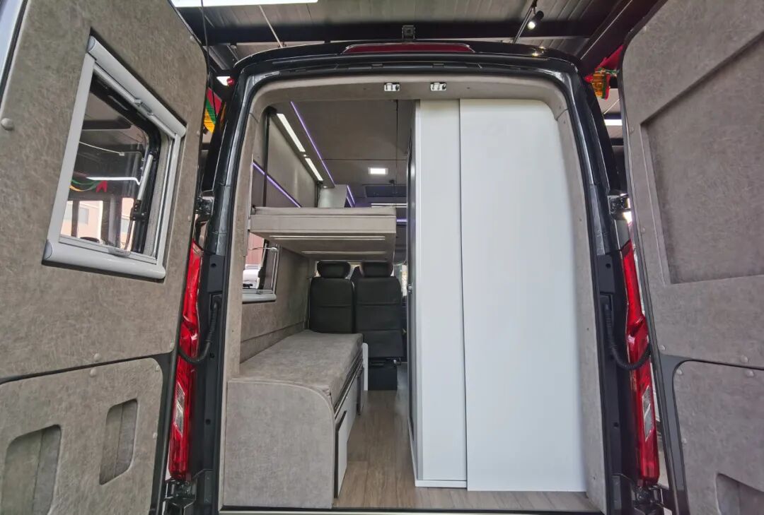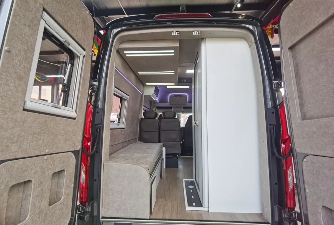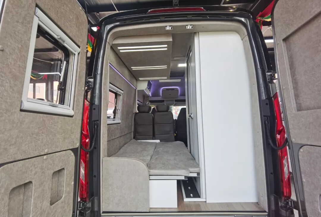 睡卧区也位于房车尾部,配有长形沙发可翻叠,同时上方配有电动吊床,组成上下铺,尺寸为1950*900mm,可满足两名成年人的睡卧需求。