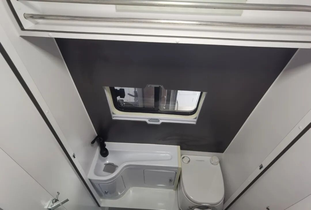 卫浴区位于房车尾部,采用半隐藏式设计,可利用滑轨推拉卫浴门,有效增加内部空间。卫生间内部配有坐便器、洗漱池、水龙头、淋浴系统、换气扇、外推窗、置物架、毛巾杆等,洗浴也很方便,同时还配有户外淋浴系统,配置多样。