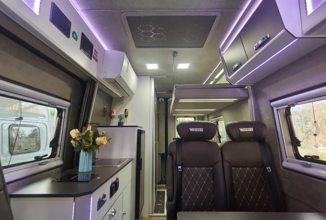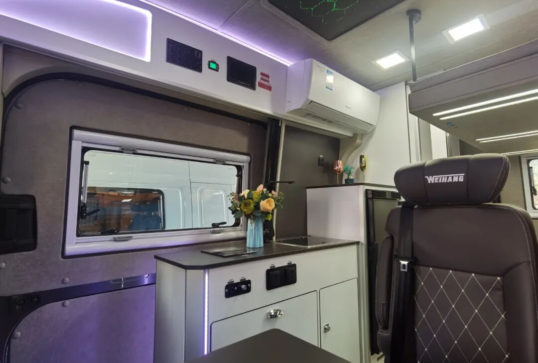 房车内部布局完善、分明,会客区、厨房区、卫浴区、睡卧区均有配置。会客区采用双人单排座椅搭配升降餐桌的设计,座椅配有三点式安全带以及扶手,保障安全的同时也能缓解旅途中的疲劳。旁侧观景车窗带有拉帘可遮阳;上方是储物吊柜,可放置日常生活用品。