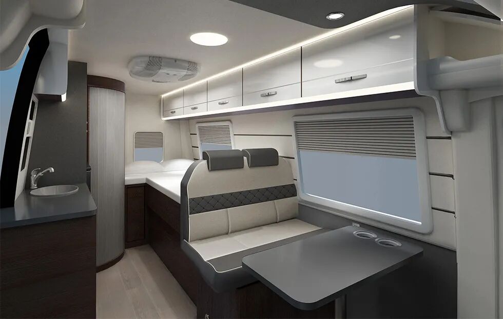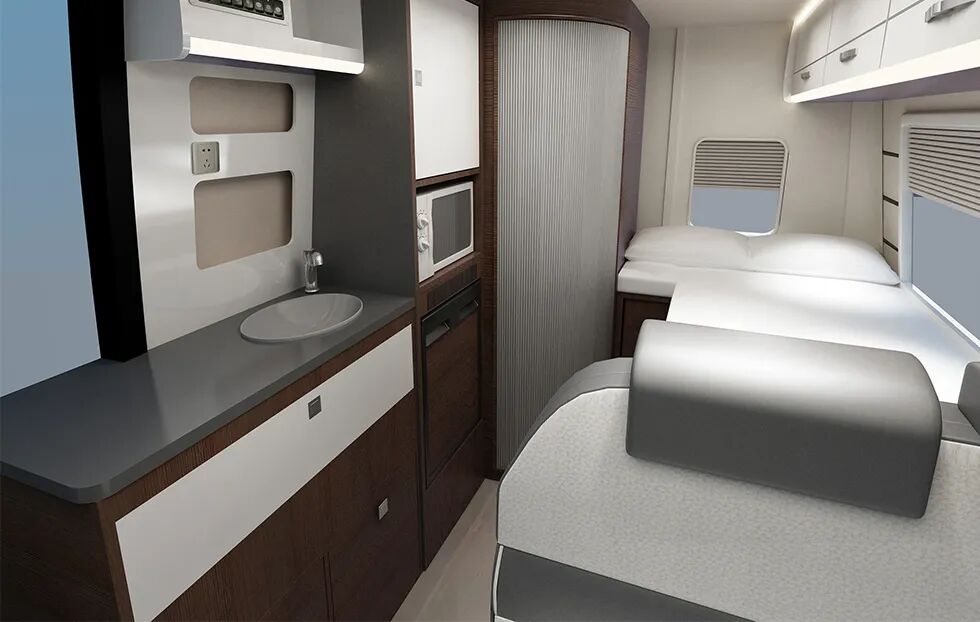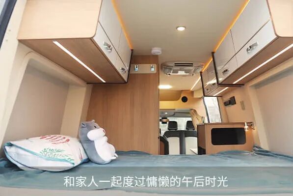 会客区采用双人卡座+可升降餐桌的设计,驻车休息时,两者可拼床,作临时休息点。餐桌上配有两个水杯槽,可以避免车身颠簸导致水杯倾倒,非常人性化。卡座一侧的超大的窗户+车内顶灯,使得车内通透明亮。窗户上方设计了一整排的储物吊柜,延伸至后方休息区,储物空间十分充足,不用担心日常用品没空间放置。还可在会客区上方加装电动升降床,增加休息空间。