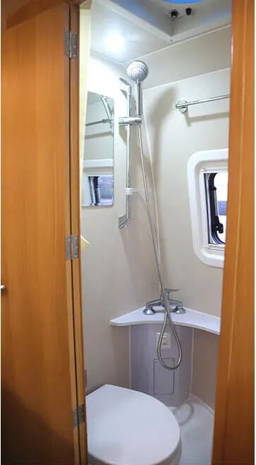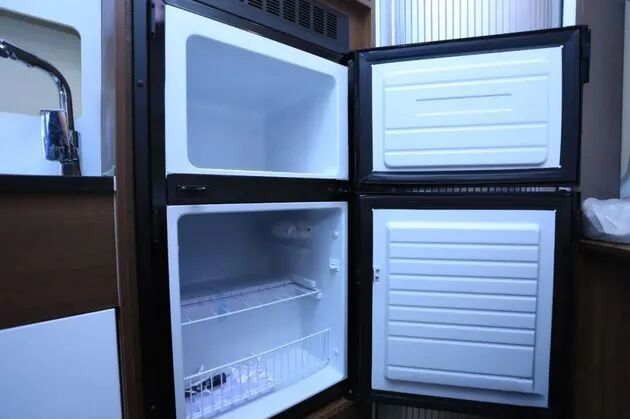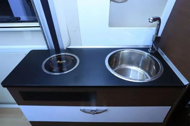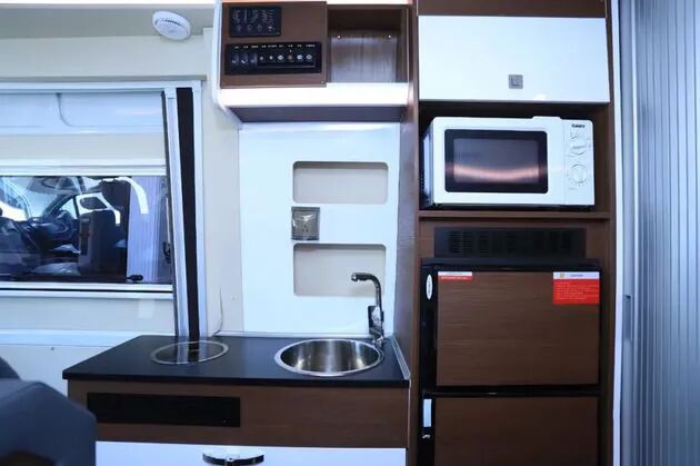 厨房区操作台不大,但配置齐全,配有微波炉、不锈钢水槽、50L冰箱,水龙头等。操作台上下皆有储物空间,餐厨用品拿取方便。操作台一侧配置的电源插座,方便乘客自行配置电磁炉。