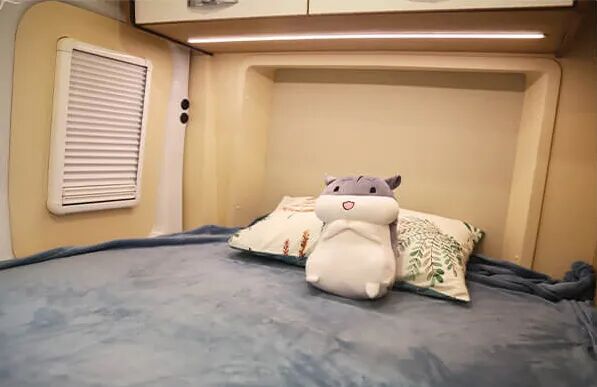 房车尾部便是一张双人床,床铺尺寸可满足两名成年人的睡卧需求,不会感到压抑局促。