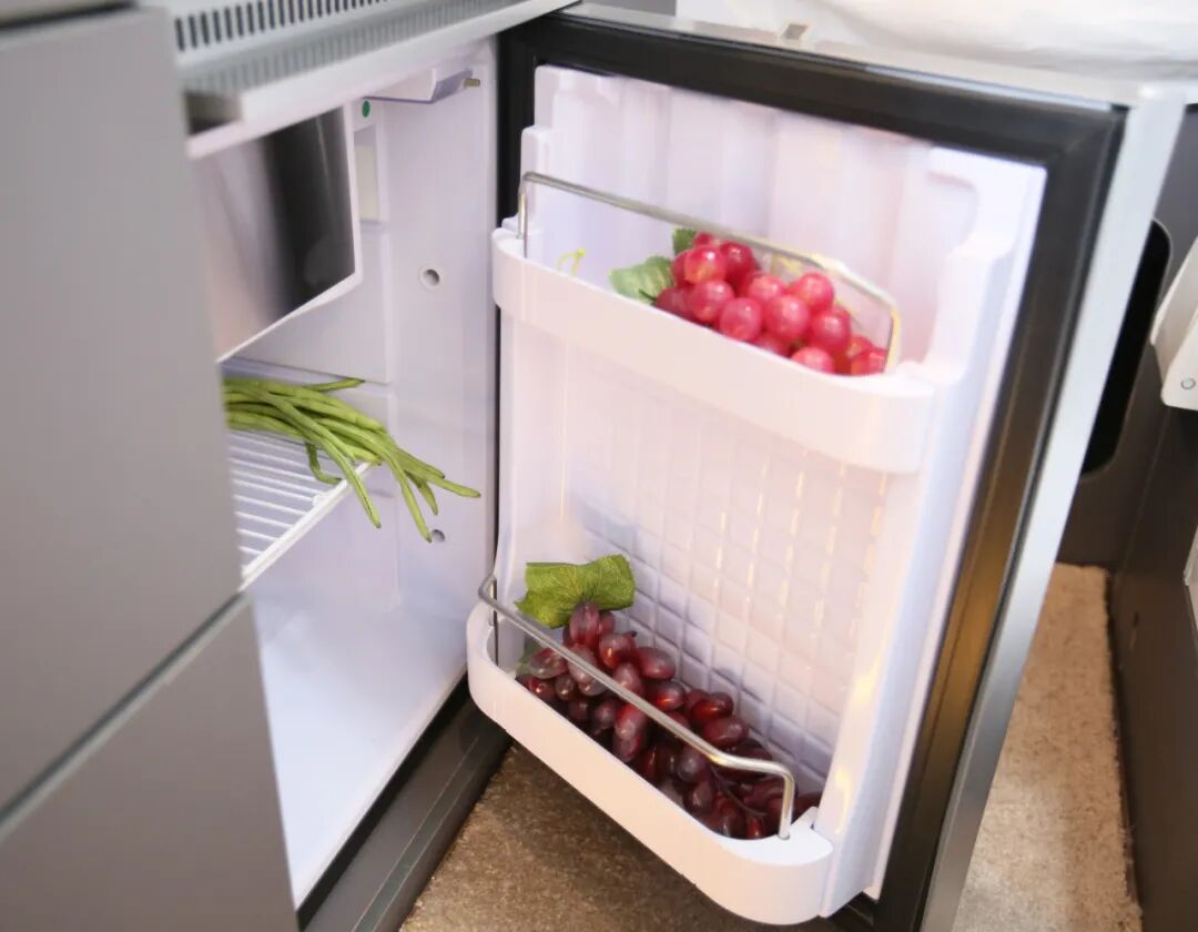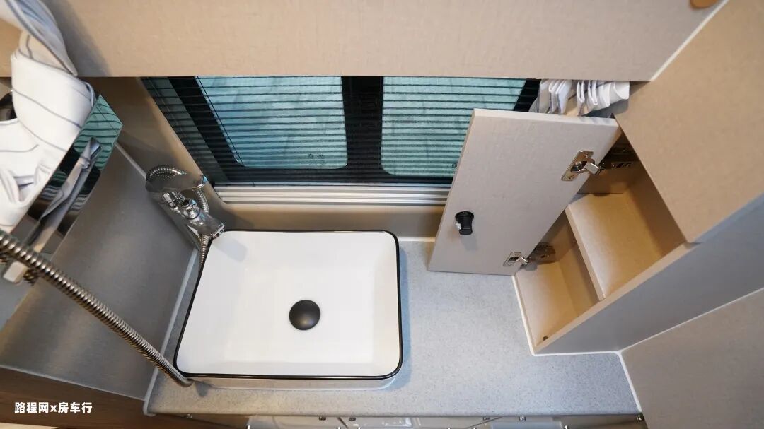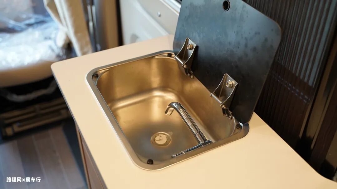 中门旁边是房车的简易厨房区,操作台面上是盖板式的洗菜盆,上下方是丰富的储物抽屉,分类收藏更方便。同时整车也是标配50L车载冰箱,能满足短途出行储纳需求。