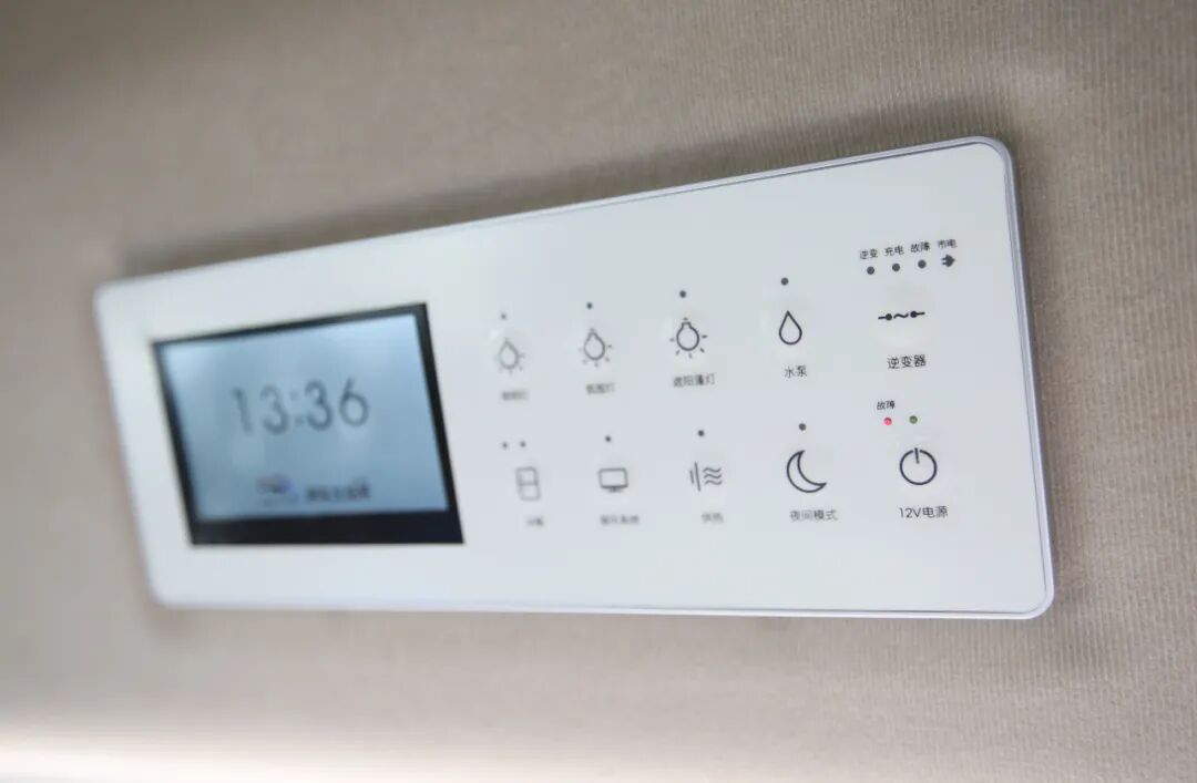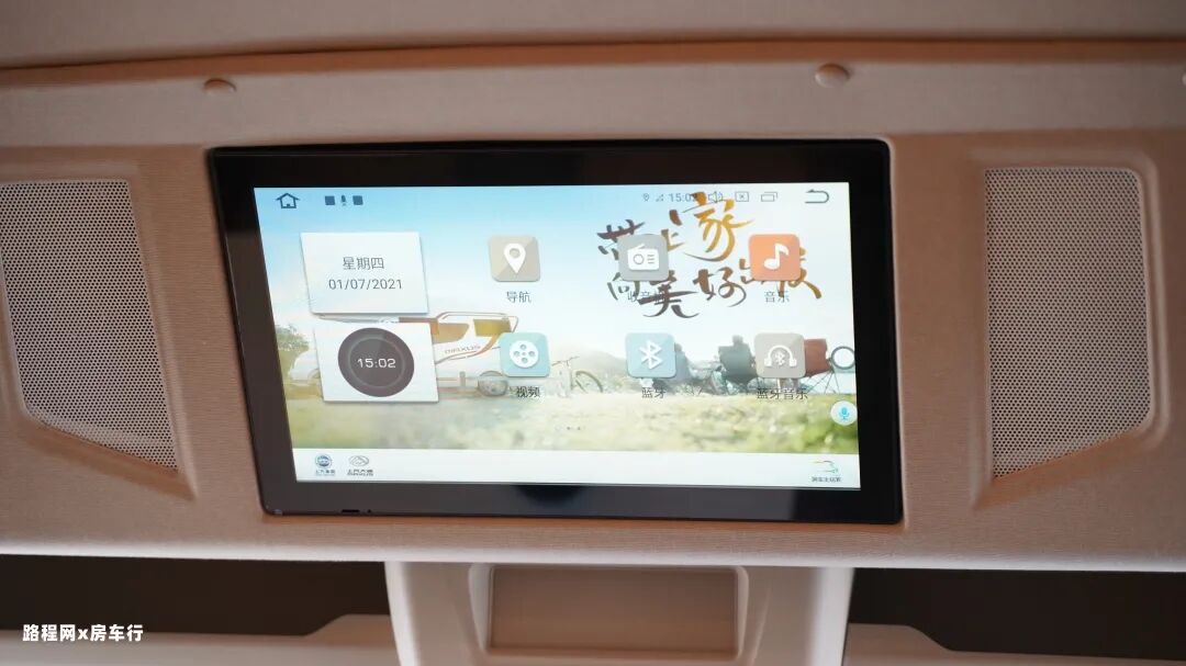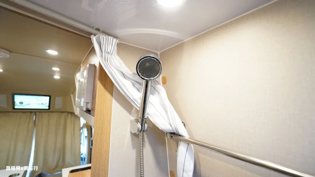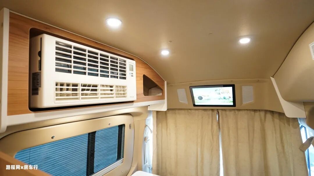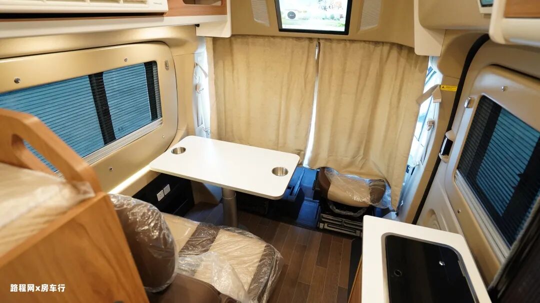 会客区前方是配有隐私帘,可保证车内生活空间的私密性;上方触控式的智能电视也能为出行提供影音娱乐。