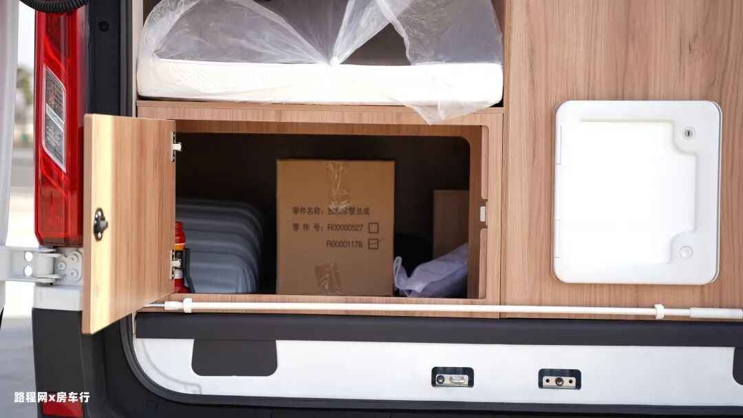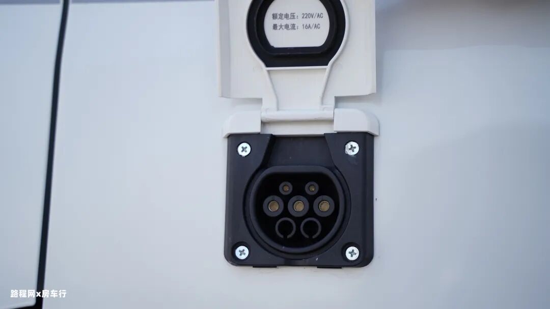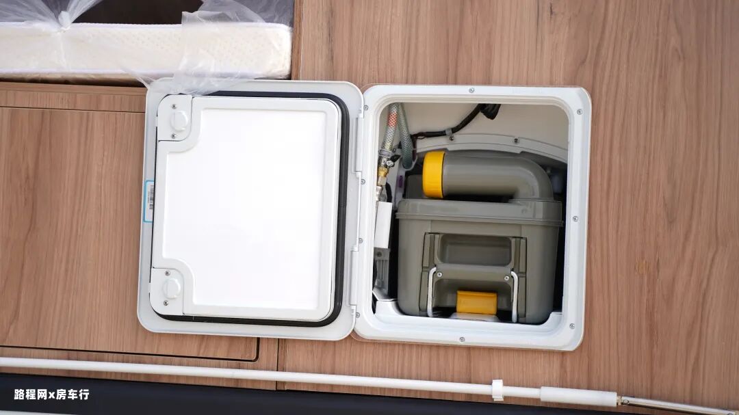 尾门也可双开,打开后可以很直观的看到整车在尾部的位置配置了黑水箱和床下储物空间。左侧车身主要配置了新能源市电接口。