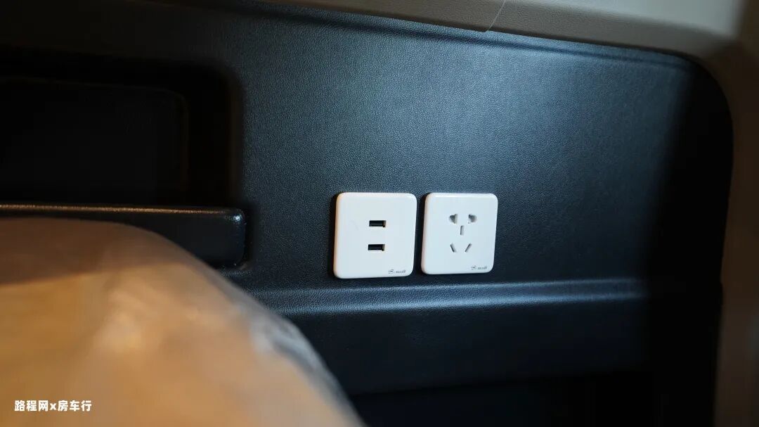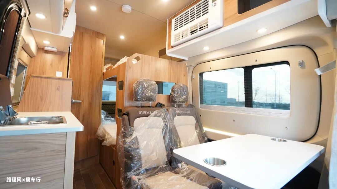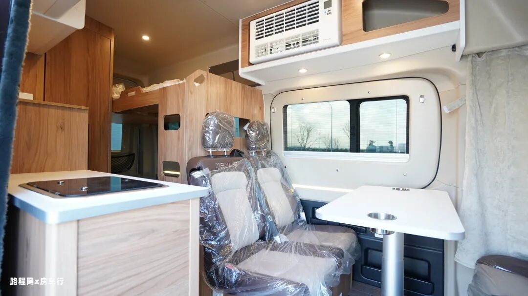 驾驶室后方是房车的会客休息区,会客区配置了多功能餐桌(可升级为电动餐桌)和双人桌椅,座椅旁边有多个多孔插座来方便用户给相应的电子用品充电蓄能。
