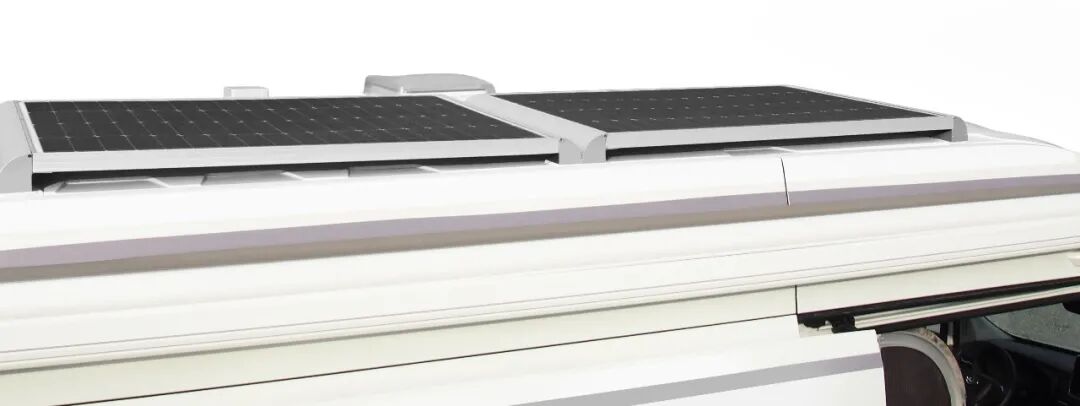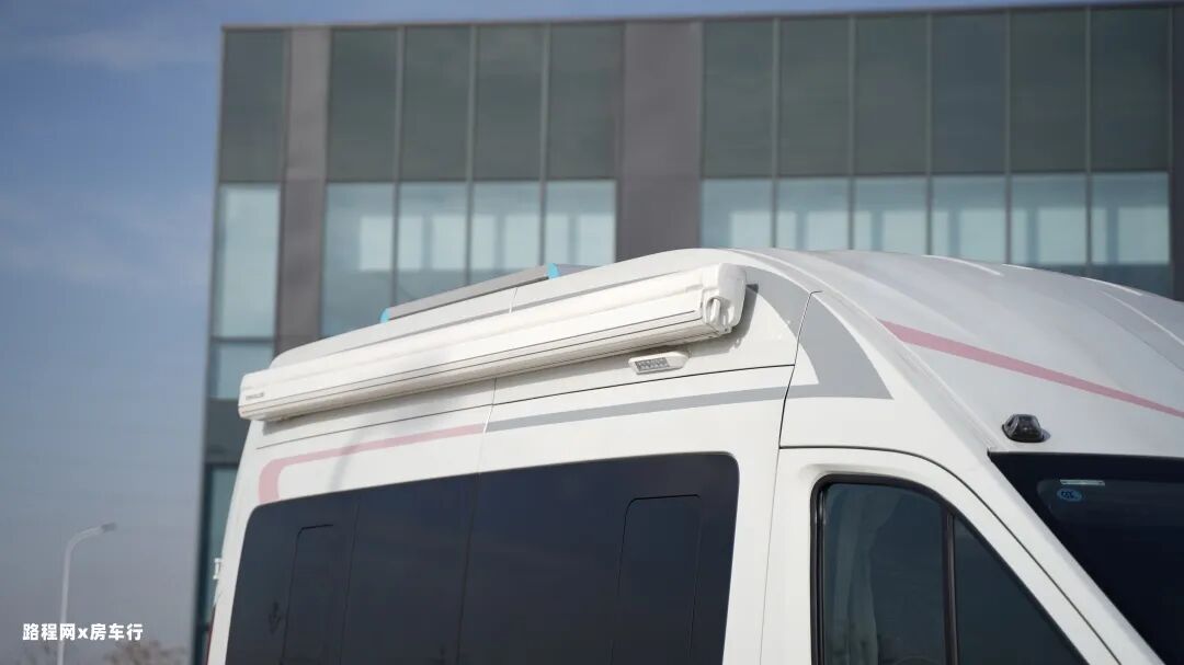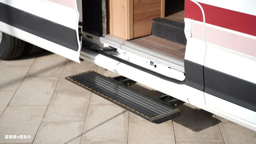 在房车的上方也是配备遮阳棚和户外照明灯的;电动的伸缩式踏步方便车友上下车。