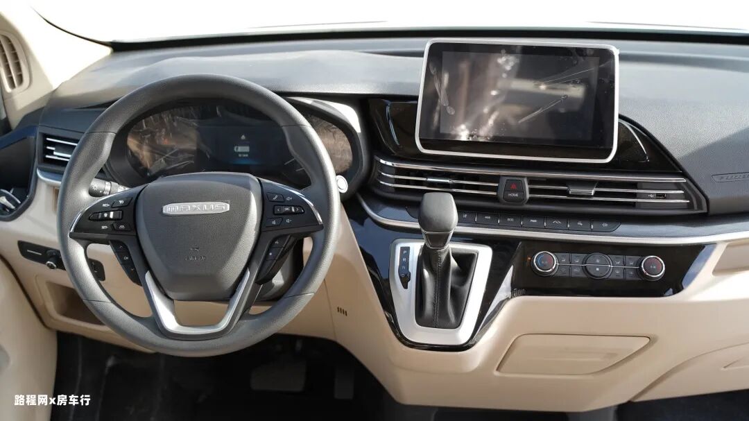 进入车身内部,驾驶室区域是配置了主副单人驾驶旋转座椅、自带MAXUS标志的真皮多功能方向盘、流媒体后视镜、10.1英寸高清触控大屏、4.2英寸仪表、蜘蛛智联、定速续航、倒车雷达、最新版本的博世ESP9.3电子稳定辅助系统、ACC自适应巡航系统、LDW车道偏离预警、AEB自动刹车辅助及FCW前向碰撞预警等智能辅助系统。