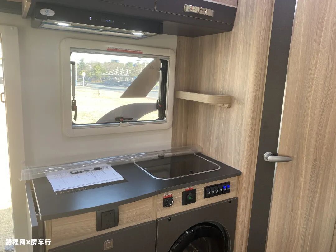 厨房区位于上车门左侧,配有房车专用吸油烟机、电磁炉、微波炉、152L塞特福德冰箱、房车专用带盖水槽+折叠水龙头、置物架、外推窗、电源插座等;不仅如此,房车外部配有抽拉式厨房以及预留5KG燃气罐舱,同时满足顾客在室内、户外烹饪需求。