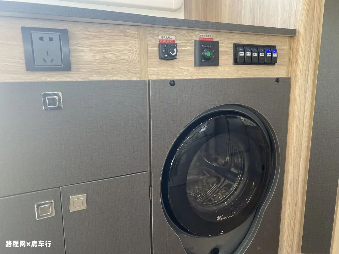 紧挨着厨房区的便是卫浴区,内置房车专用坐便器、独立淋浴花洒、洗漱盆、水龙头、置物架、毛巾杆、梳妆镜、外推窗、换气扇、卫浴帘等。同时还配有3KG小天鹅洗衣机(带烘干)以及户外淋浴器,配置比较丰富。