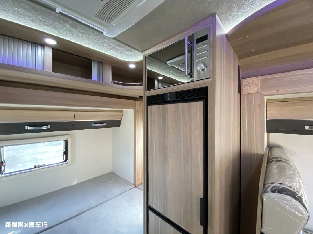房车尾部是可拓展睡卧区,拓展后可满足两名成年人的睡卧需求。上方配置储物柜,以及周围配有外推窗,可保证车内的采光度。