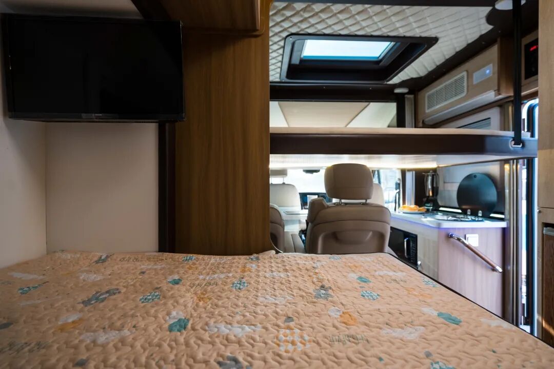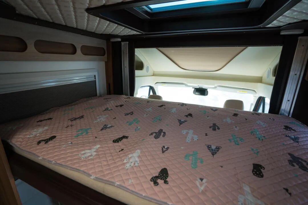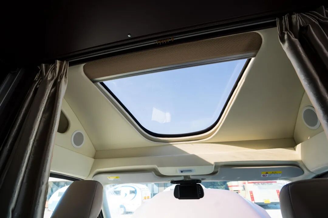 当然如果是小家庭出行的话,还可利用座椅上方的升降吊床来增加相应的床位,升降床的尺寸是1200x1800mm,也很宽敞。在升降床的上方也是配有天窗的,不压抑还能欣赏夜晚的星空。