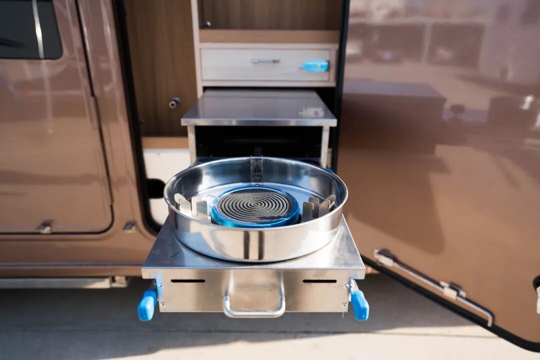 座椅旁边即是房车的厨房区,厨房区不算大但够用,带盖板洗菜池、橱柜、微波炉等设施均有。天气好时还可配合车外的抽拉式燃气灶来烹制食物,享受家的味道。