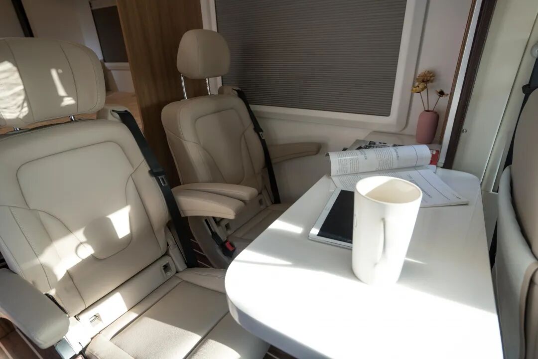 房车内部驾驶室与生活区是贯通式的设计,座椅为前二后二的设计,实用合理。后排座椅为正向的商务座椅,可大范围的前后移动,乘坐更加舒适宽敞,也可缓解长途旅行的不适感。