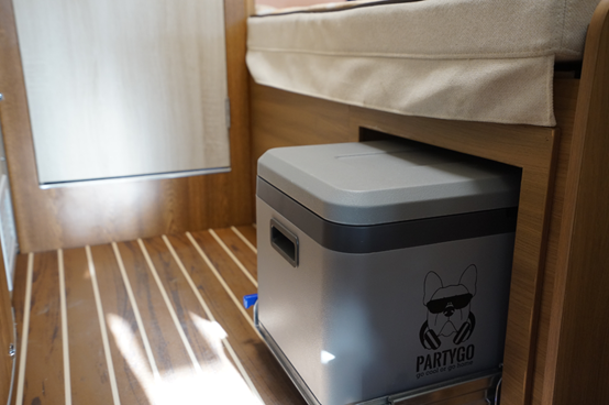 而除了床铺上方的顶置吊柜之外,中意房车还设有专门的储物橱柜来收纳行李,整体的存储空间相对富足。在储物区还巧妙的嵌入了车载冰箱来冷藏食材饮品,冷冻箱是在床铺的下方。