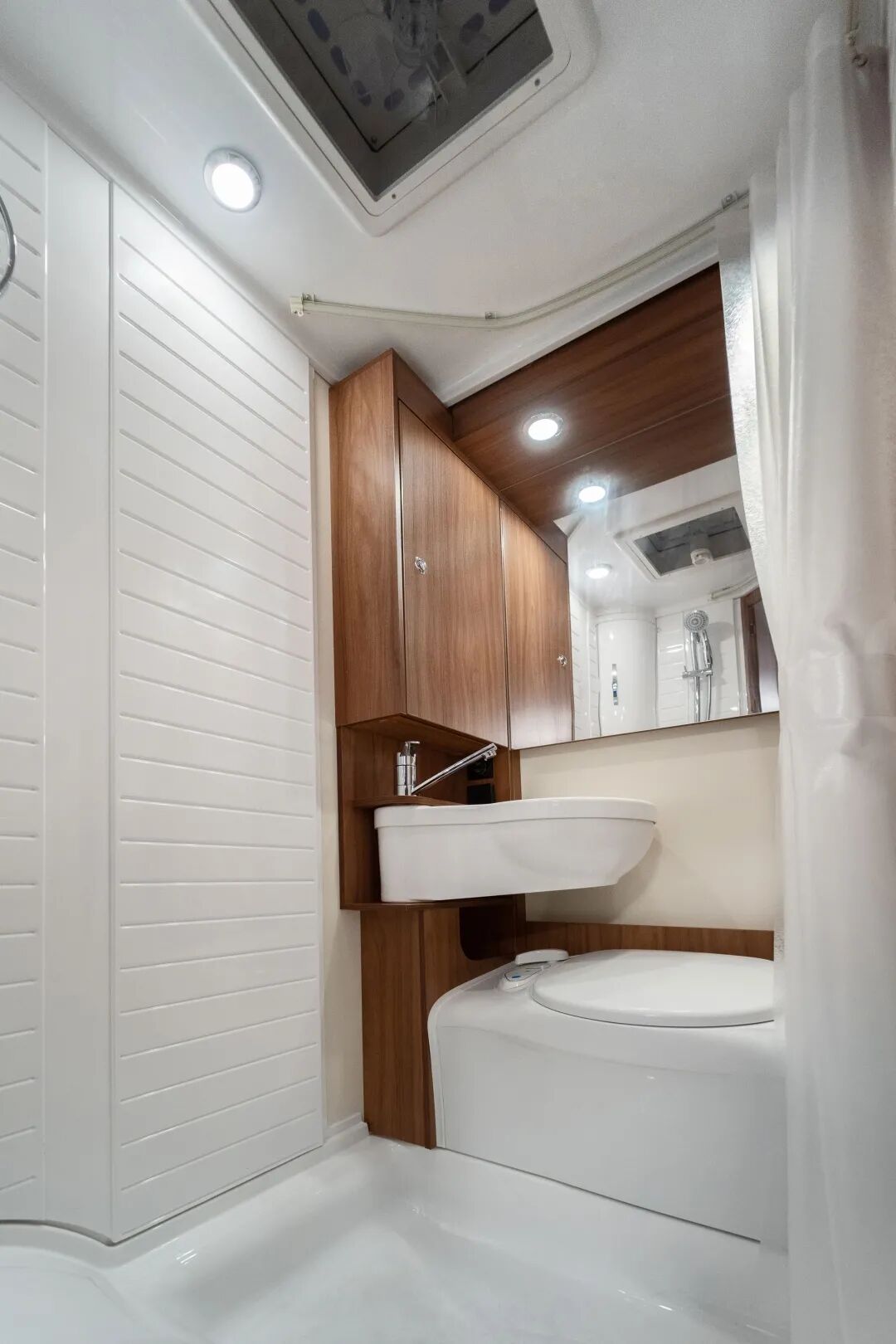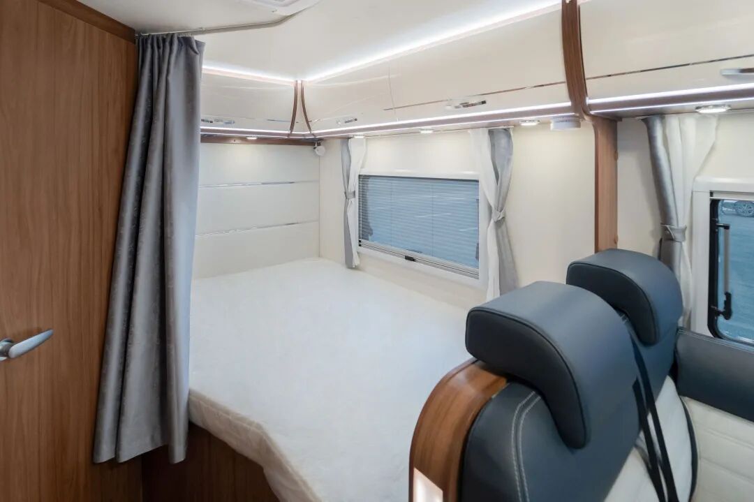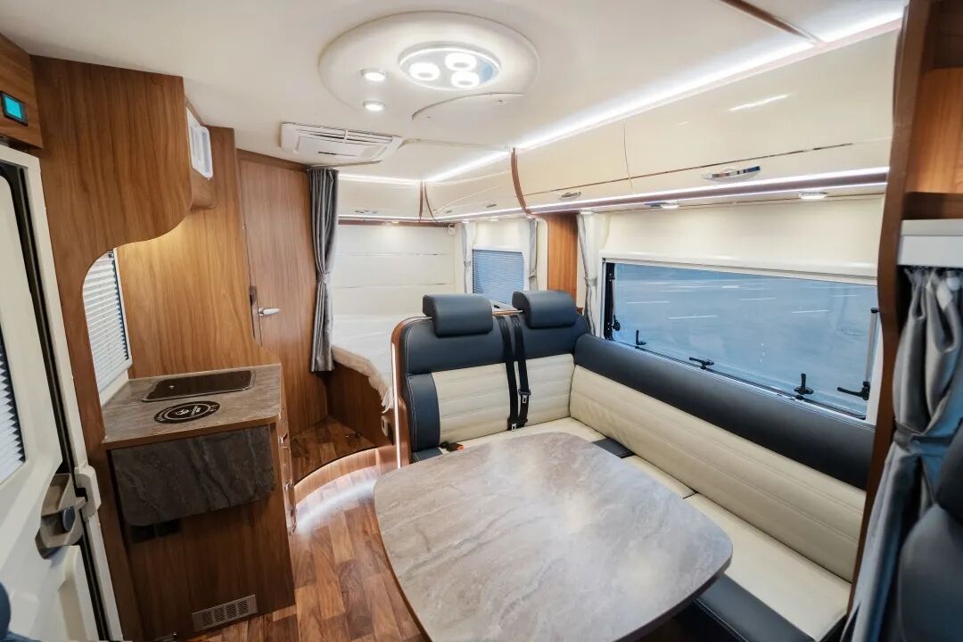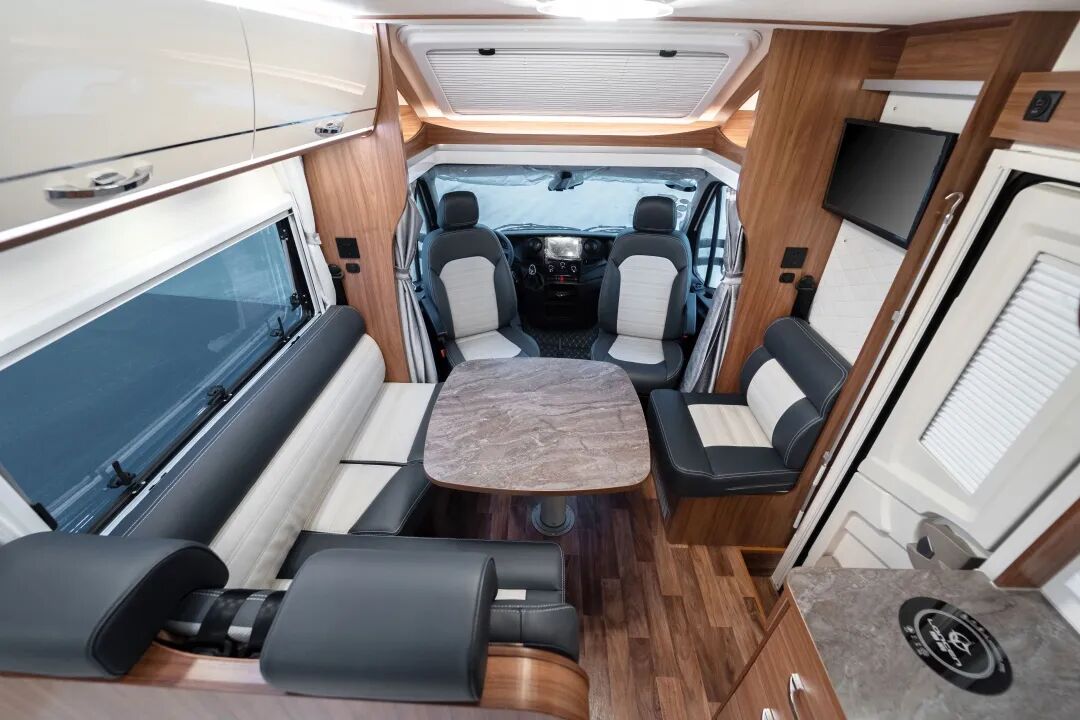 L型座椅上方设有多个顶置吊柜,座椅下方也有小的储物空间 ,单人座椅上还有智能电视机可供会客娱乐,驾驶室上方的弧形天窗利于采光也不压抑。