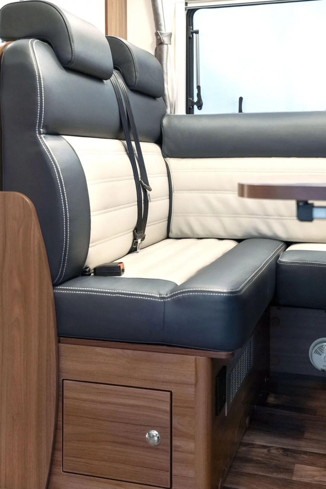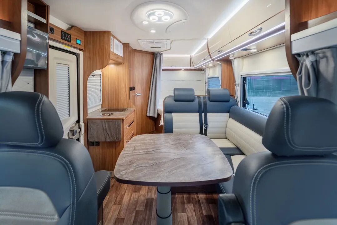 车身内部撞色搭配前卫时尚,蓝咖双色的组合给人自然稳定的感觉。驾驶室主副座椅均可向后旋转,可与L型沙发卡座+单人座椅+升降餐桌形成一个完整的会客区。
