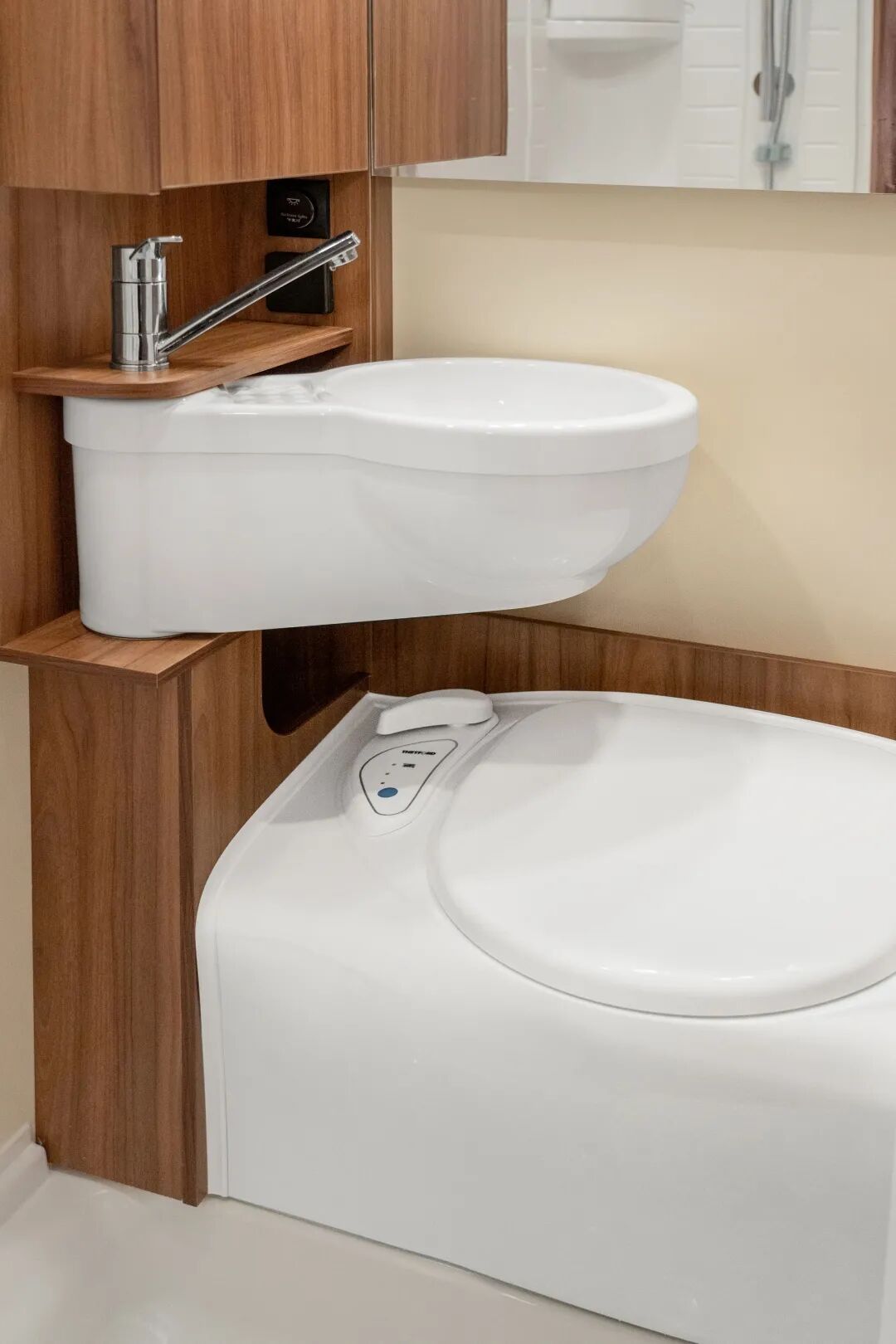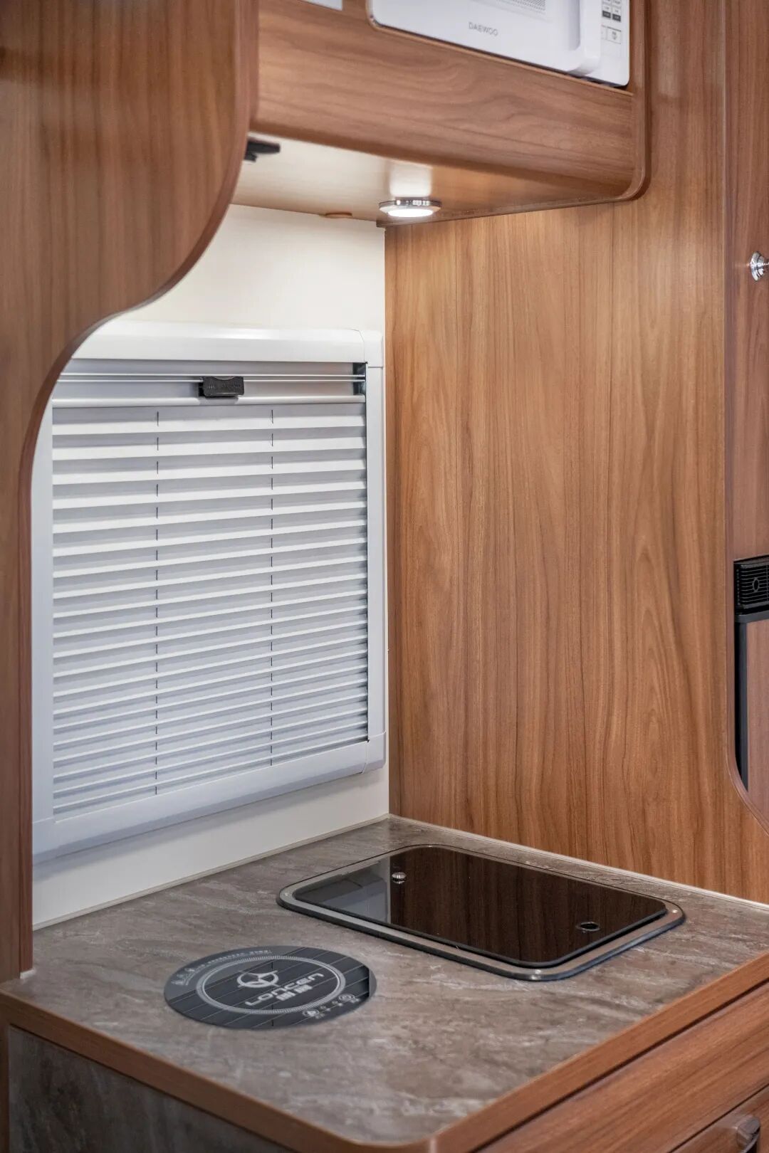 厨房区位于进车门的旁边,配有电磁炉、盖板洗菜盆、微波炉、储物抽屉、拓展桌板和148L房车专用冰箱等设施,日常简餐完全可以解决。