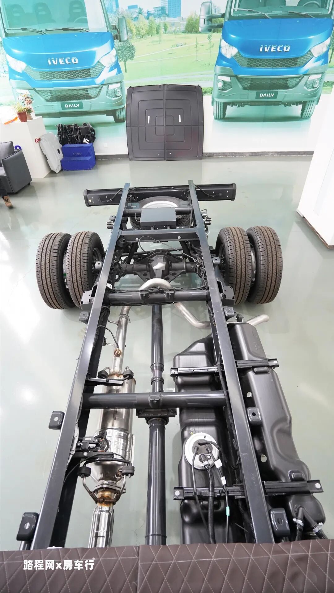 后桥部分标配空气悬挂,这是进口依维柯NEW DAILY底盘的一大特色。同时国六版本也是配备了20L的尿素箱的,尿素箱在驾驶室的下方。