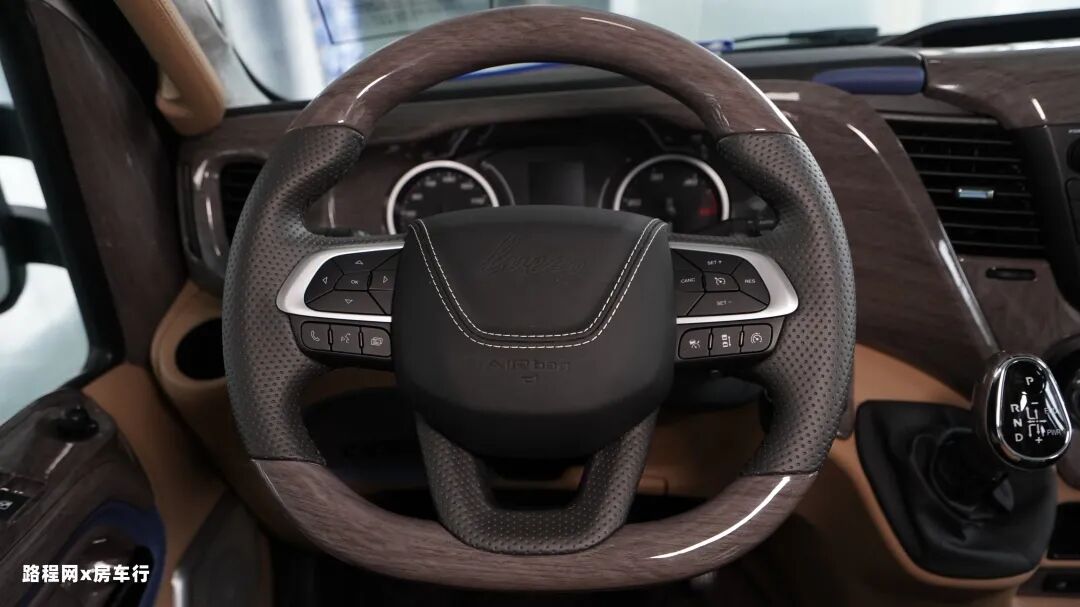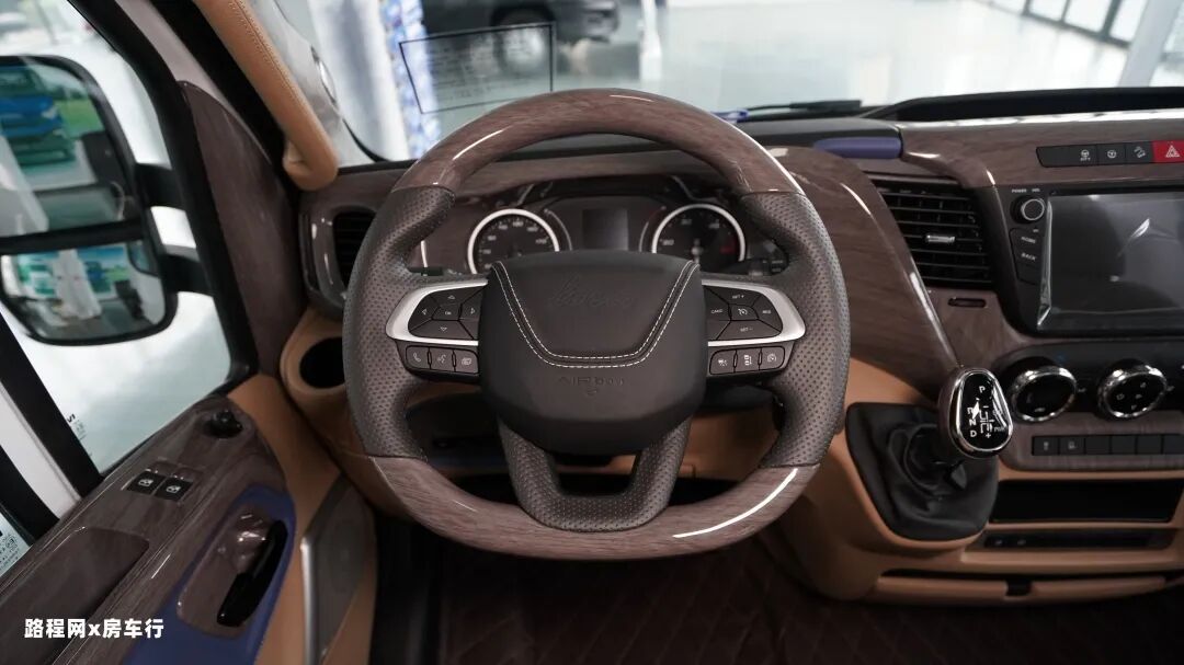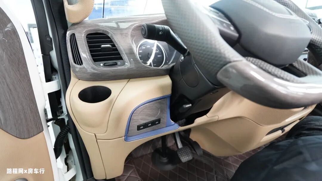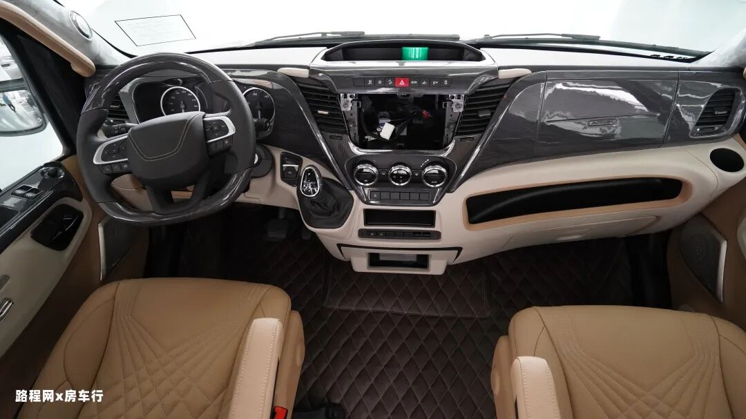 驾驶室内部的内饰风格是有比较大的升级与改动,驾驶室内部采用了大面积的仿木材质及下部超纤包裹的设计,顶部和侧柱配置了翻毛皮的材质,整体的内饰组合给人的感觉更加高端,也更加匹配NEW DAILY底盘的身份形象。