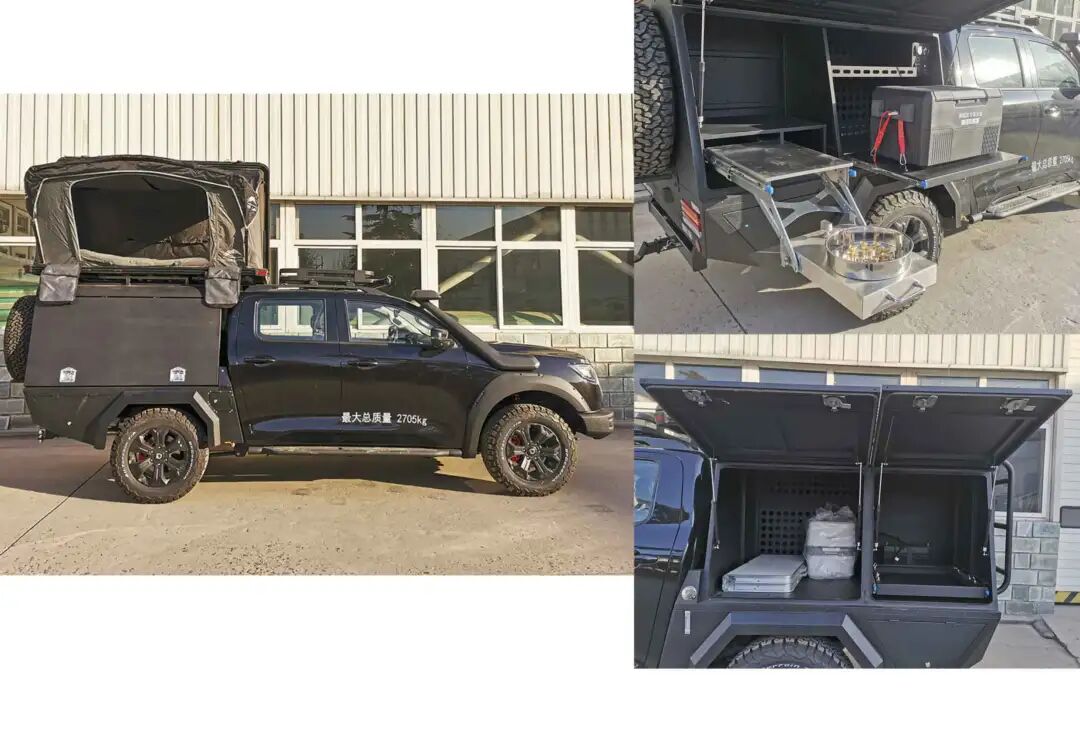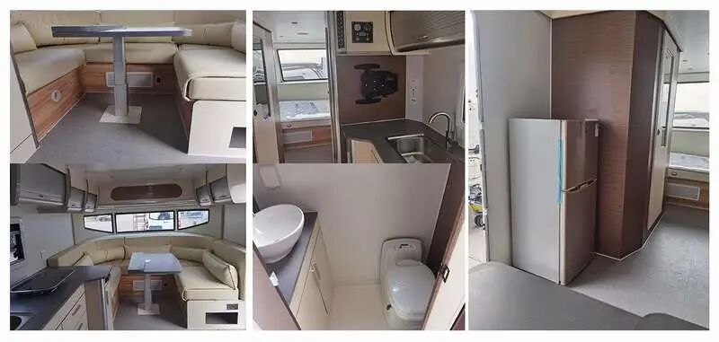 1、侧防护为裙边结构,材质为高强度铝合金,后防护材质为钢质,断面尺寸(长×宽)mm:100×50,离地高度:465mm,连接方式均为螺栓连接;2、配备桌椅,厨具,睡具,卫生设施等旅居生活设施