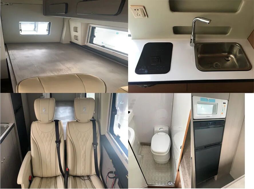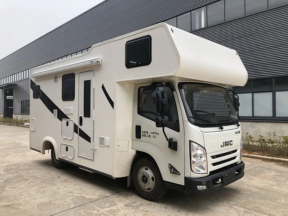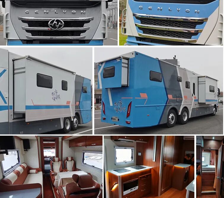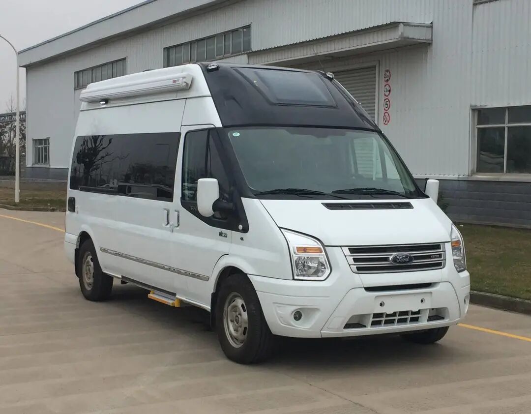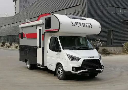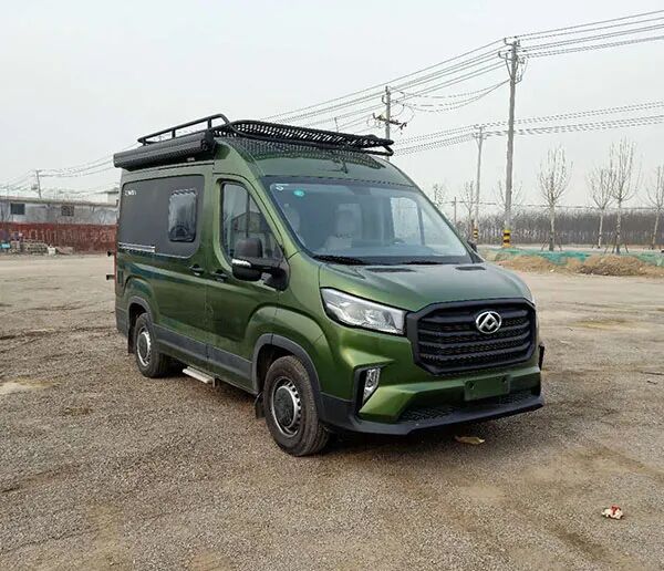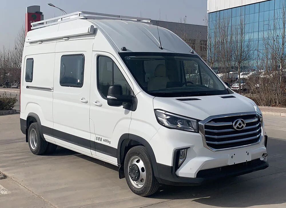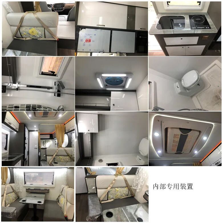 整车装配有桌椅,卧具,厨具,卫生间,电视等旅居专用配置;仅选用驾驶室后围有贯通开口的底盘改装。车辆配装车载终端;选装侧遮阳篷,选装备胎包,选装自行车架,选装爬梯;选装太阳能电池板;选装换气扇;选装空调;选装天窗;车体左右窗户数量和位置可以调整,右侧舱门位置可调整,车体可在侧面及后部加装驻车空间扩展机构;