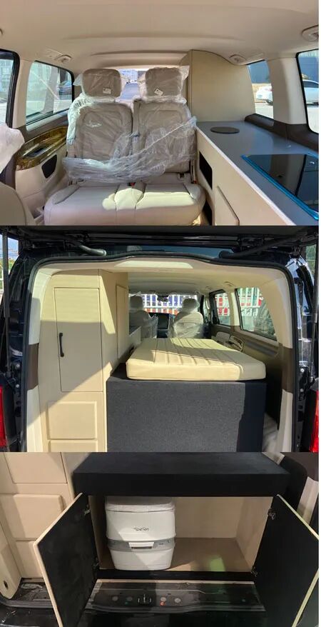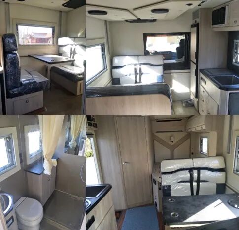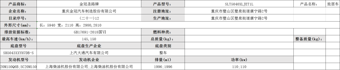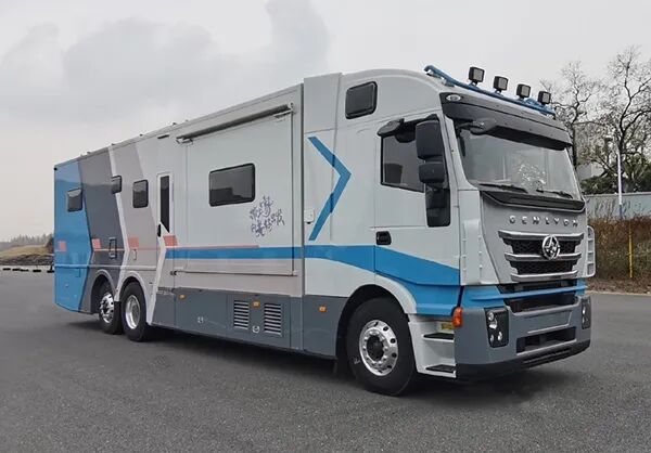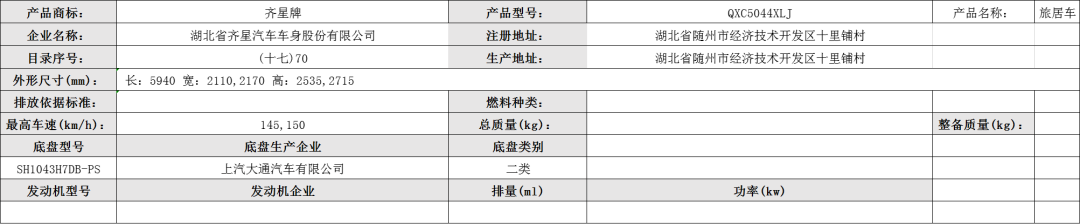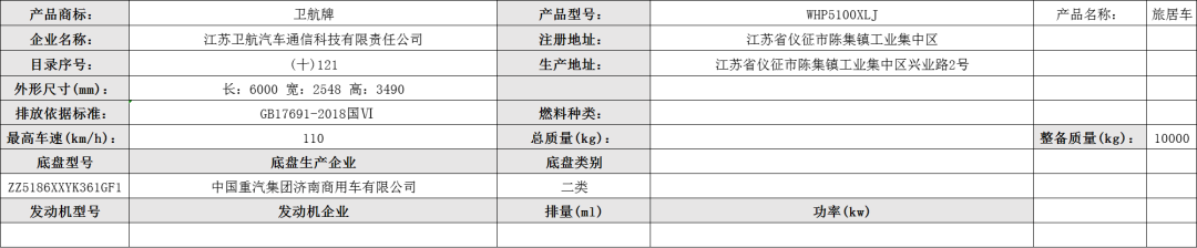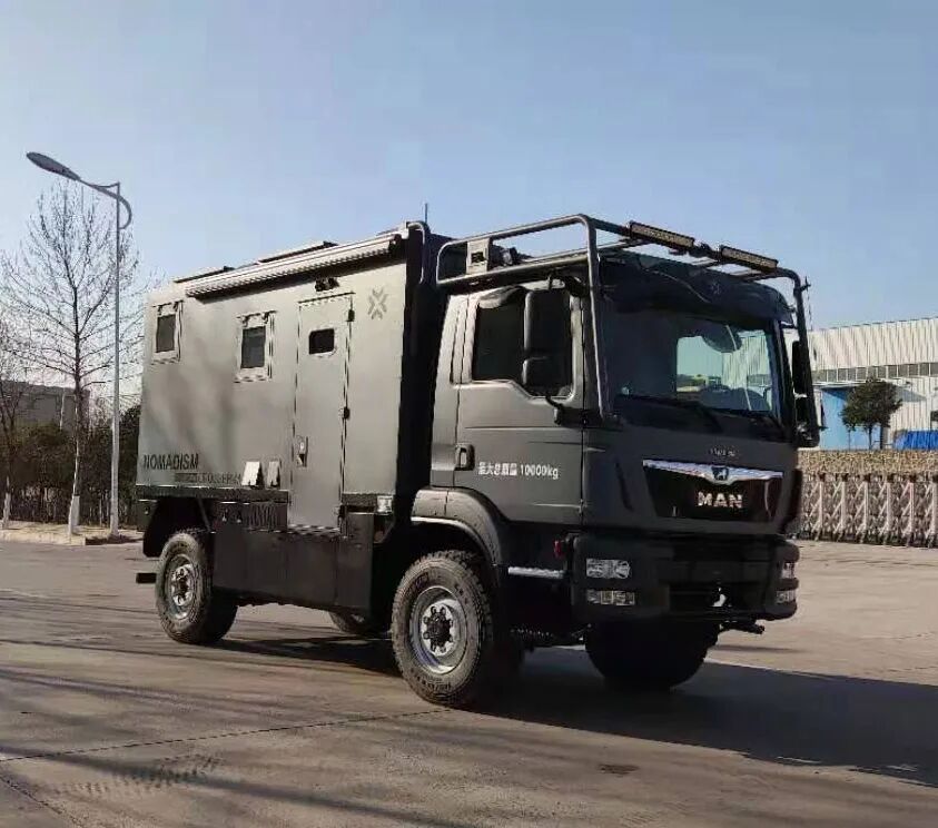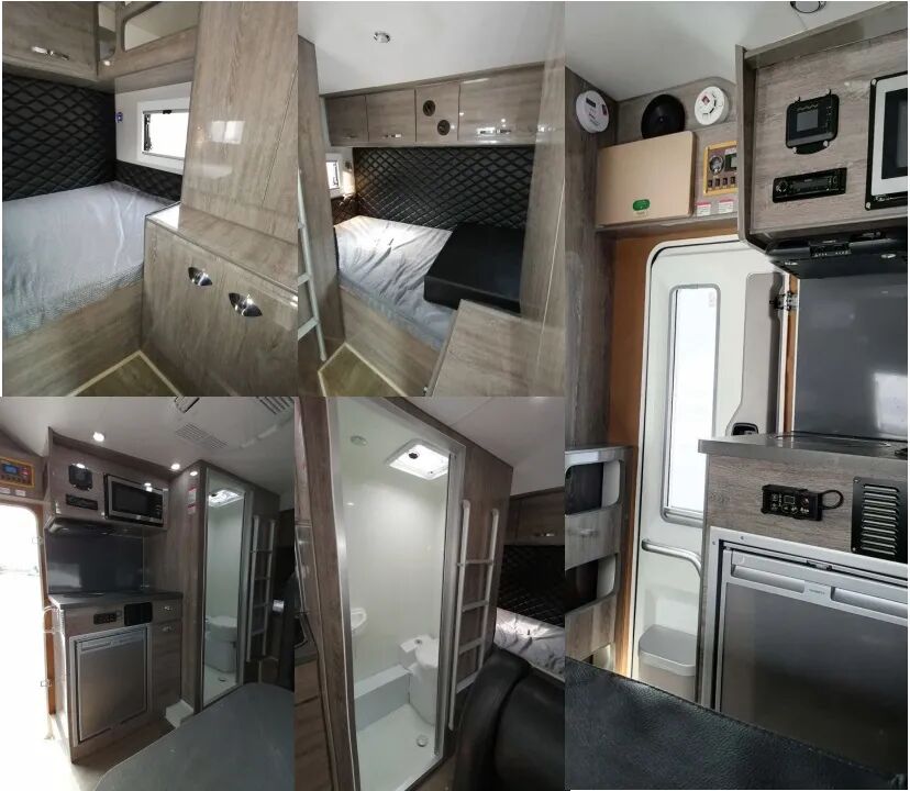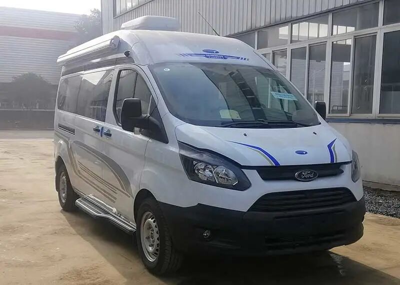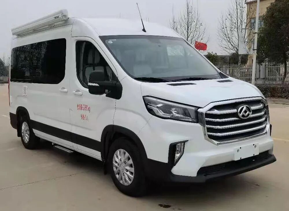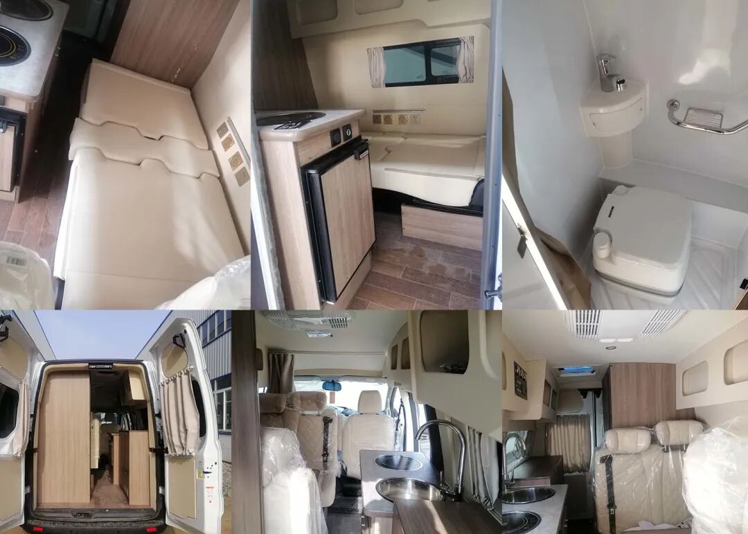 整车装配有桌椅,卧具,厨具,卫生间,电视等旅居专用配置;仅选用驾驶室后围有贯通开口的底盘改装。车辆配装车载终端;选装侧遮阳篷,选装备胎包,选装自行车架,选装爬梯;选装太阳能电池板;选装换气扇;选装空调;选装天窗;车体左右窗户数量和位置可以调整,右侧舱门位置可调整,车体可在侧面及后部加装驻车空间扩展机构;