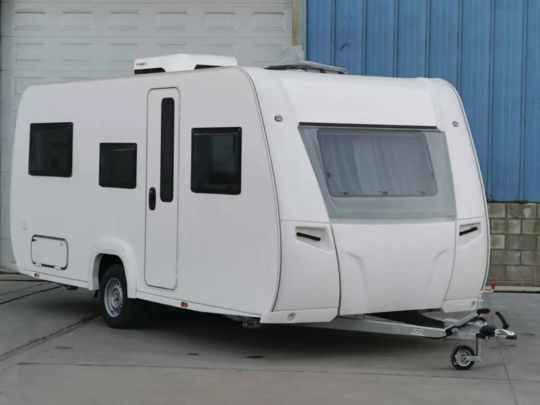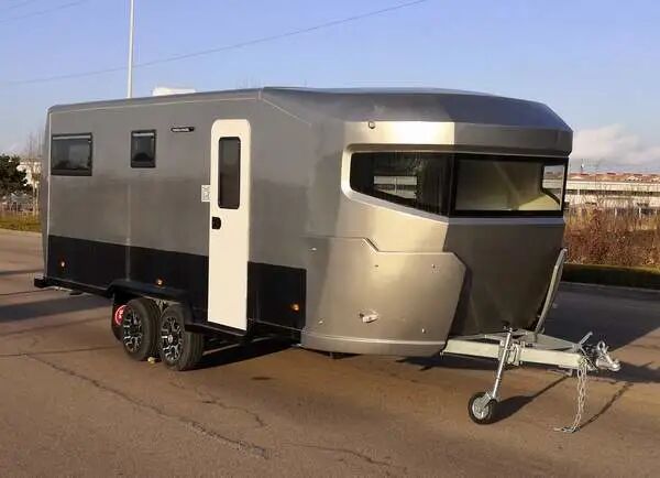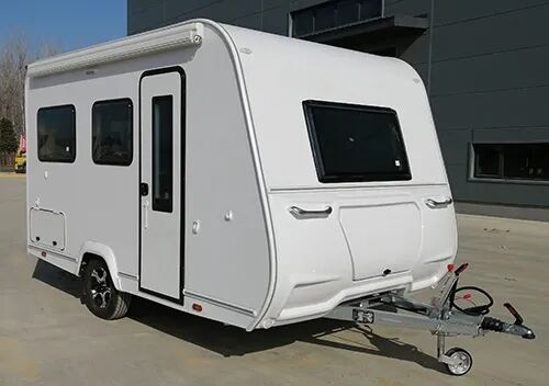 该车非乘用车,行驶过程中不载人;车厢顶部封闭,不可开启;牵引杆深入量为55mm,连接器最大负荷120kg;选装无侧遮阳帘结构,不装侧遮阳帘时车宽为2382mm,厢体内部按旅居卧室布置,床,沙发,卫浴和厨具等,用于旅居宿营.