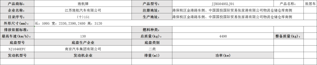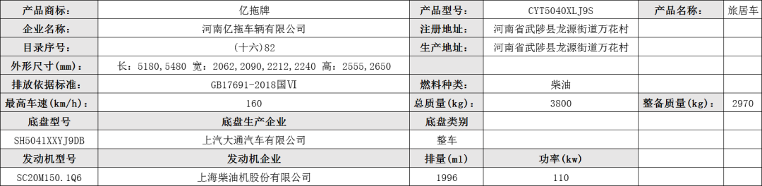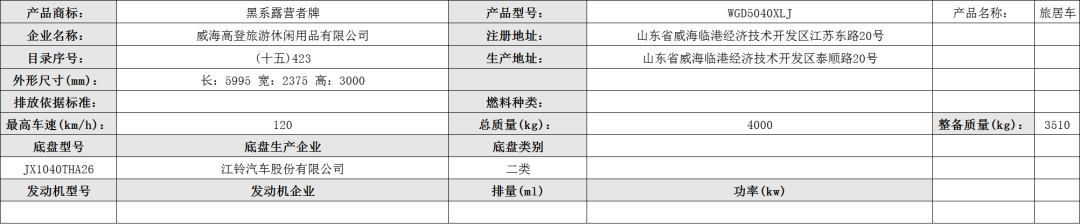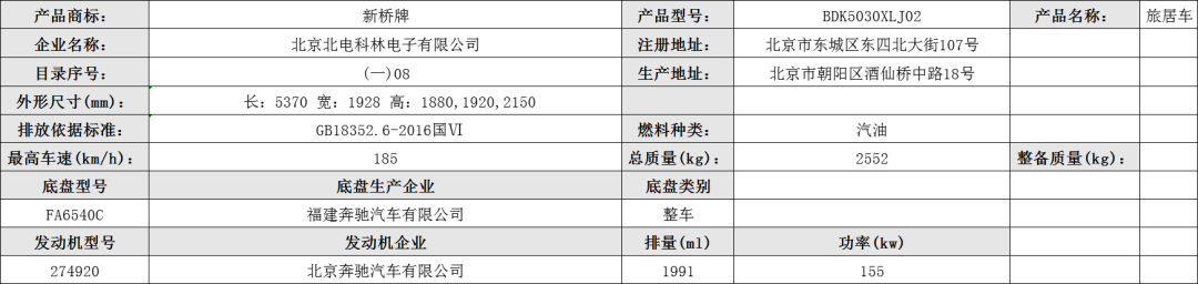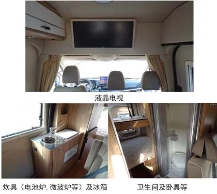 专用功能及装置:该车装备有桌子、座椅、床、冰箱、空调、马桶、电磁炉等设备,用于旅行宿营;其他说明:该车可选装ETC装置。