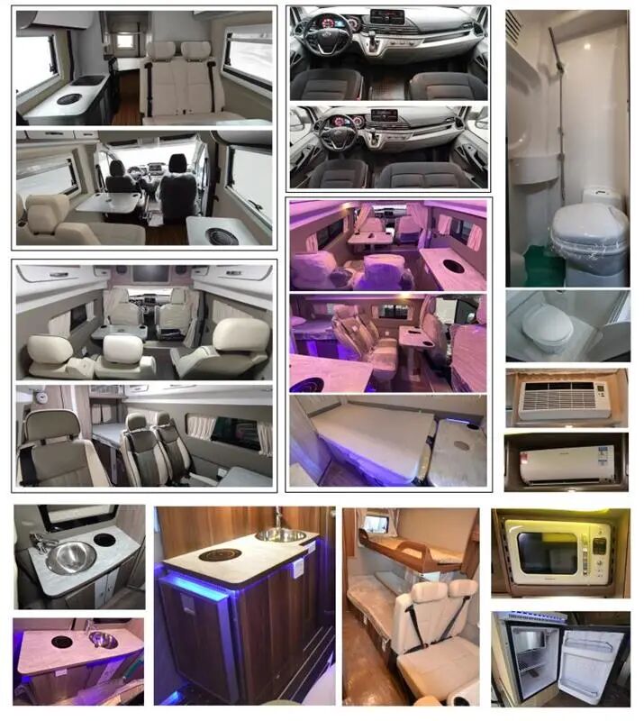 随底盘选装手动踏步,电动侧踏步、前格栅、LED前组合灯、LED后尾灯、日间行车灯、轮圈、轮饰盖、后尾标、前雾灯、后摄像头、后门开启限制;配备桌椅,厨具,睡具,卫生设施等旅居生活设施;顶部选装太阳能电池板,卫星天线