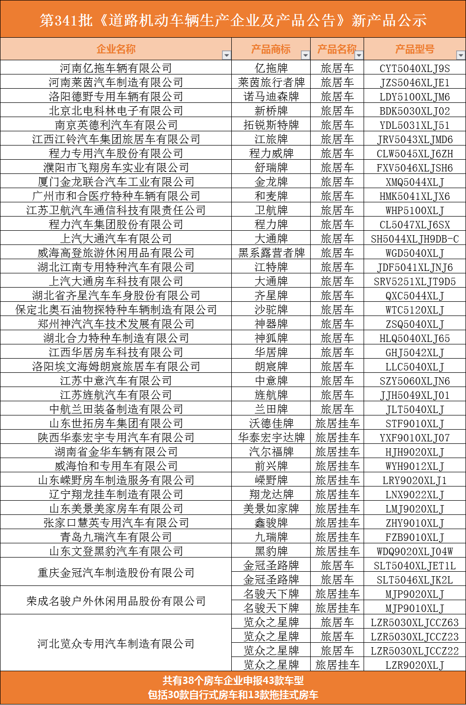 春节期间,国家工业和信息化部在官方网站公示了第341批《道路机动车辆生产企业及产品公告》(以下简称《公告》)新产品。其中共38家房车企业申报43款车型,包括30款自行式房车和13款拖挂房车,小编将具体的名单整理列出了表格,想要了解更多的小伙伴们可以去了解更多详情哦!