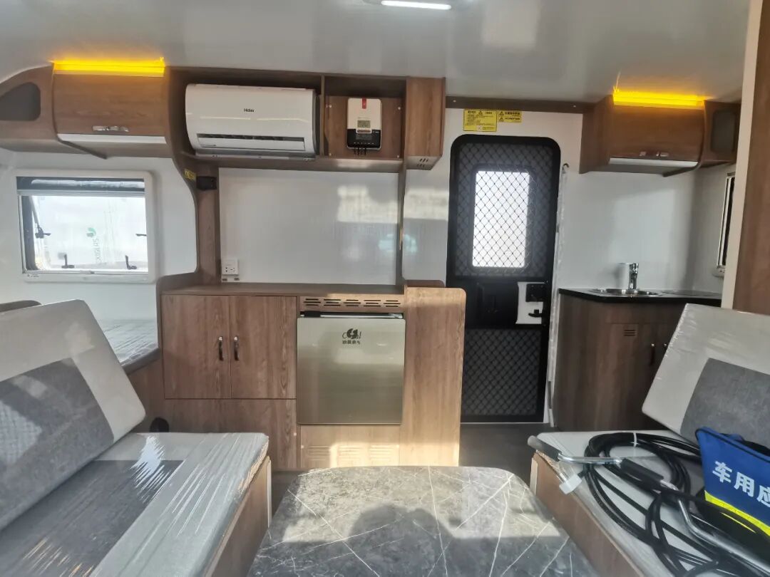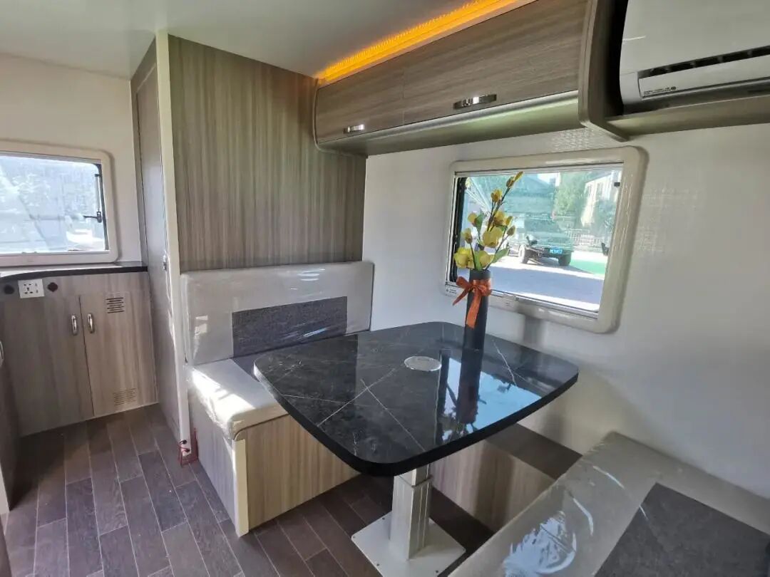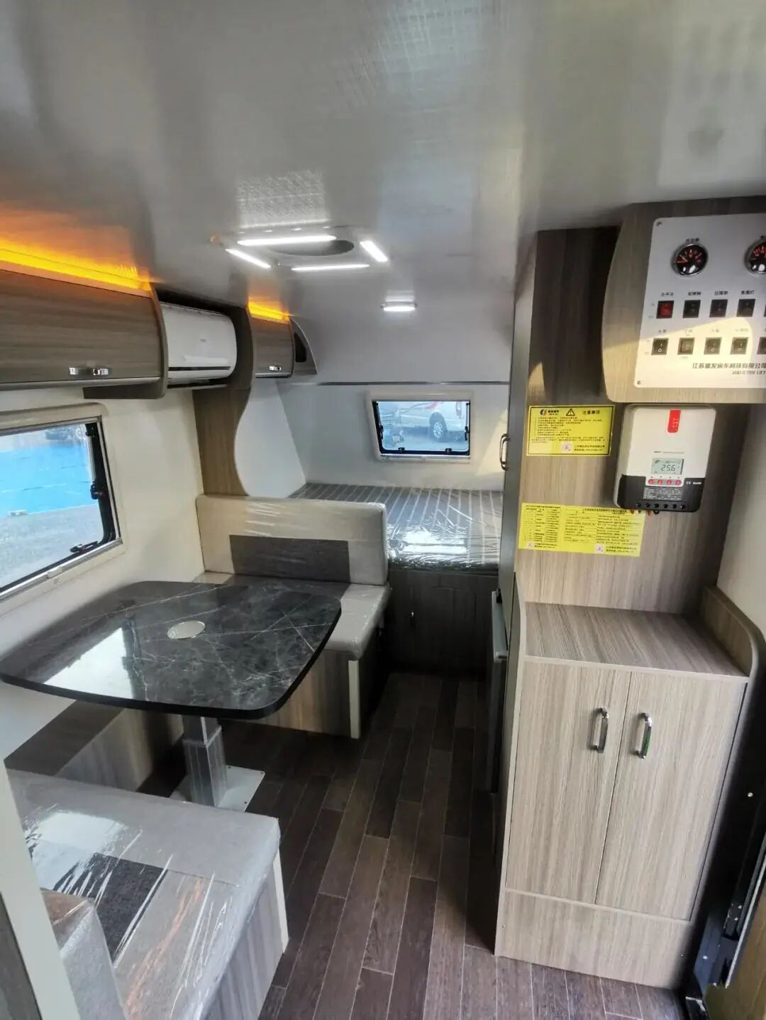 车辆中部是整车的休息区,休息区设置有两种布局,其中一种是四人对坐卡座+一体式橱柜的搭配,橱柜空间很大,足以收纳两人出行的各项行李物资,在橱柜下方还嵌有一台容积为50L的车载冰箱。卡座上方除了储物吊柜之外,设有家用式变频空调,冬夏皆宜。