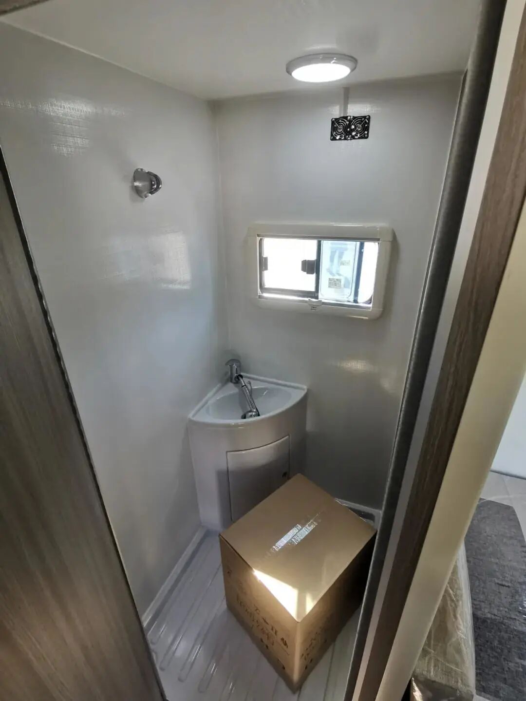 卫生间的空间较充足,内配便捷式马桶、抽拉式洗漱淋浴花洒、洗漱台盆、侧面换气扇、隐藏式晾衣绳,洗浴如厕是没有问题的,后期也可以选装固定式的马桶。