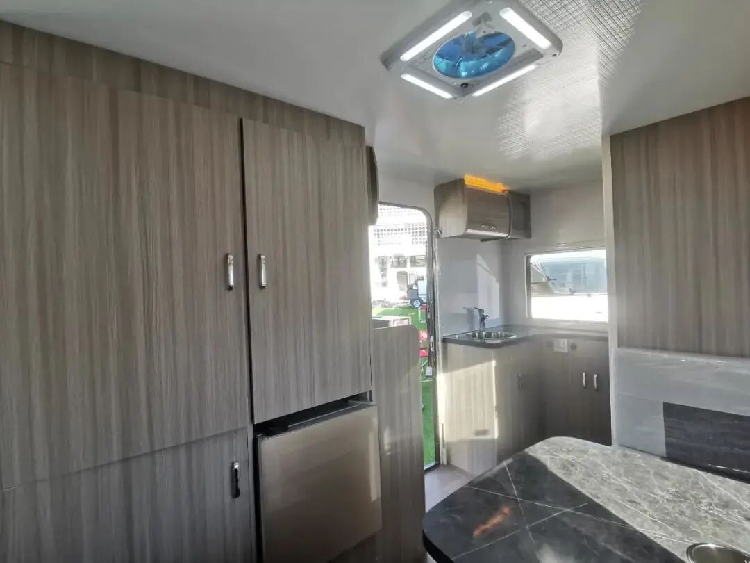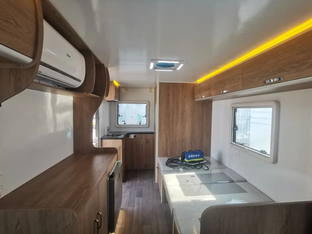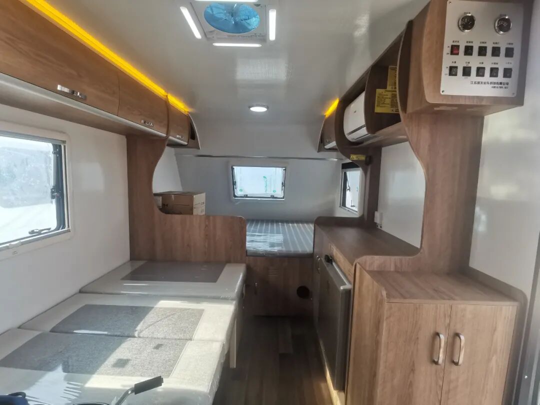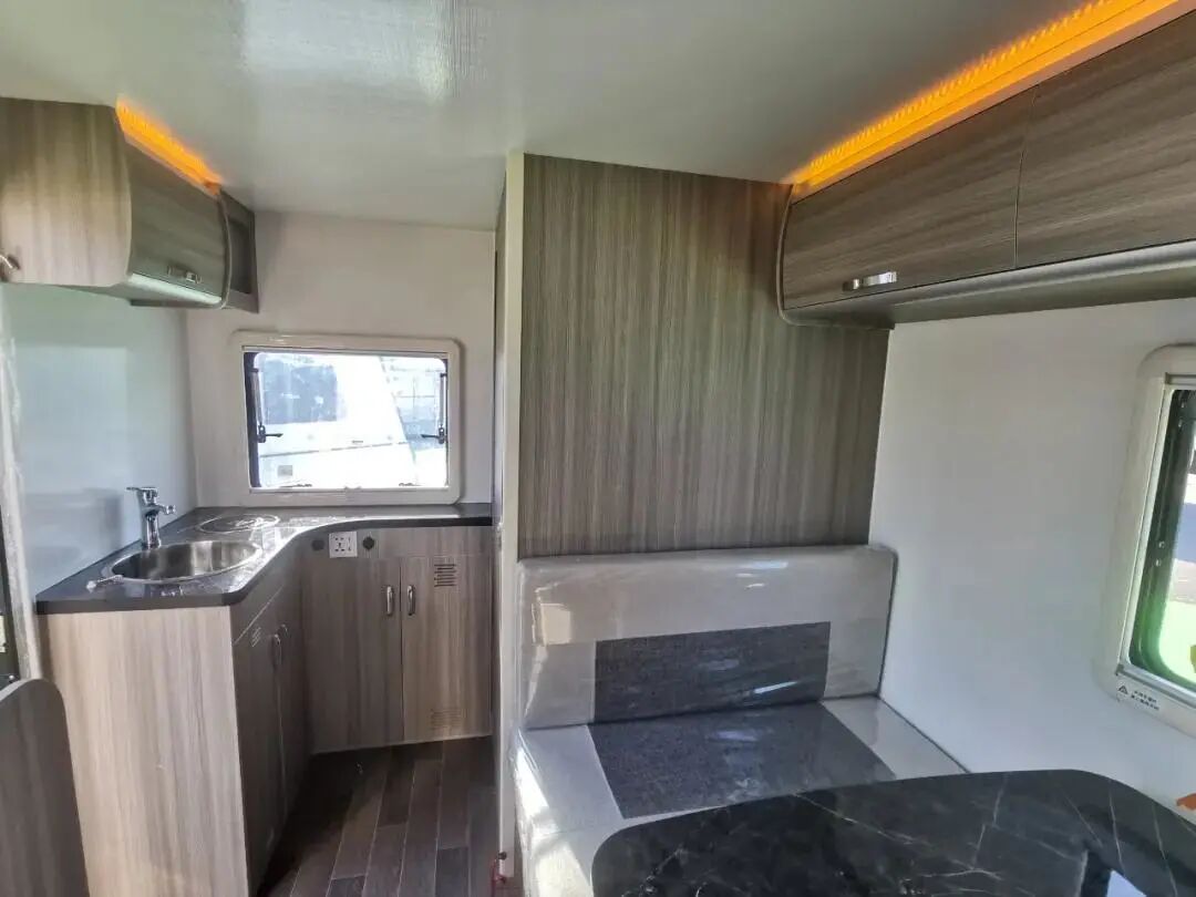 车辆内部厂家提供了两种布局,没有大的差异,但功能侧重不同。后上门的设计,进入车内就是该车的厨房空间和卫浴间,厨房L型造型设计美观贴心,操作面积宽敞,洗菜池、电磁炉、多孔插座和丰富的储物柜都是有的。
