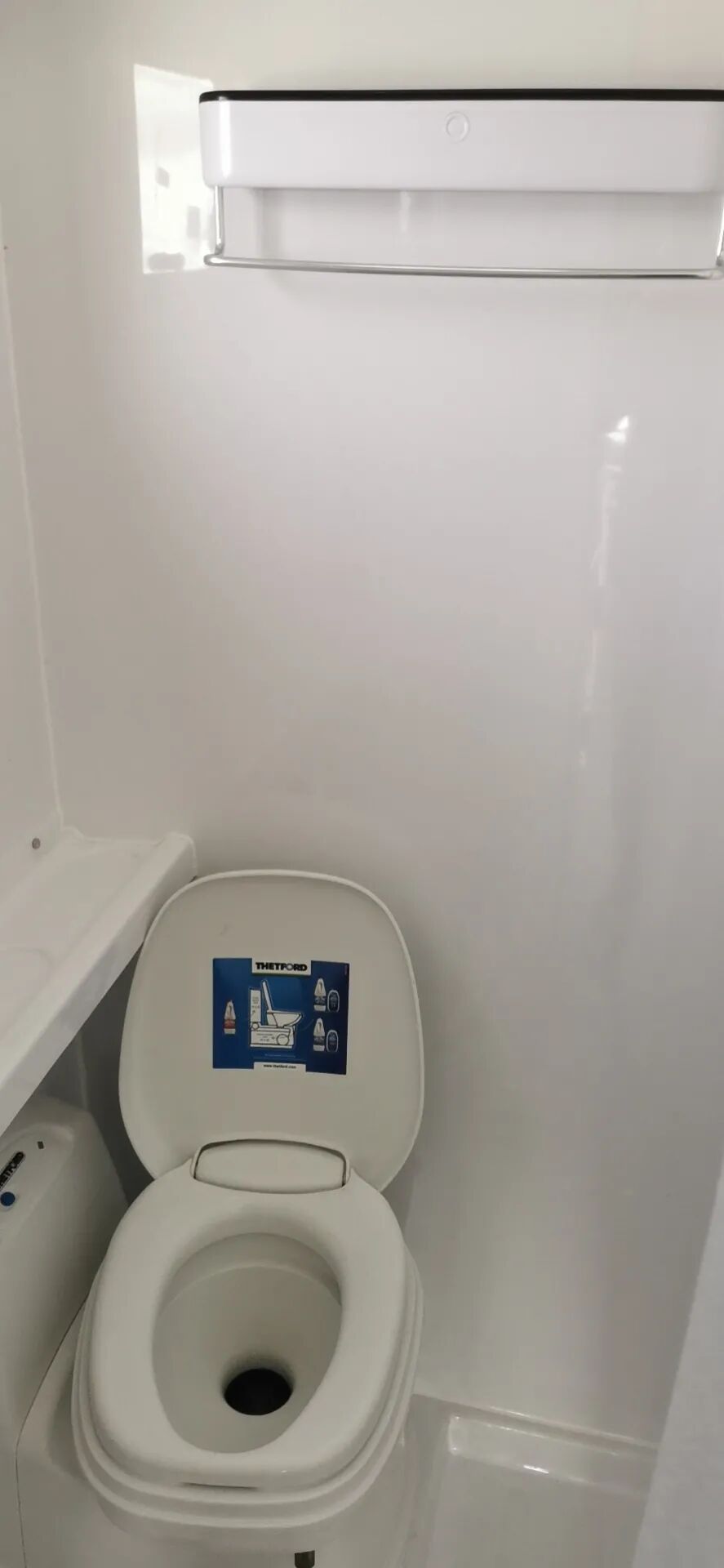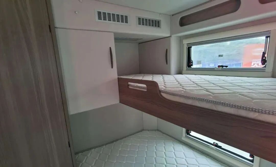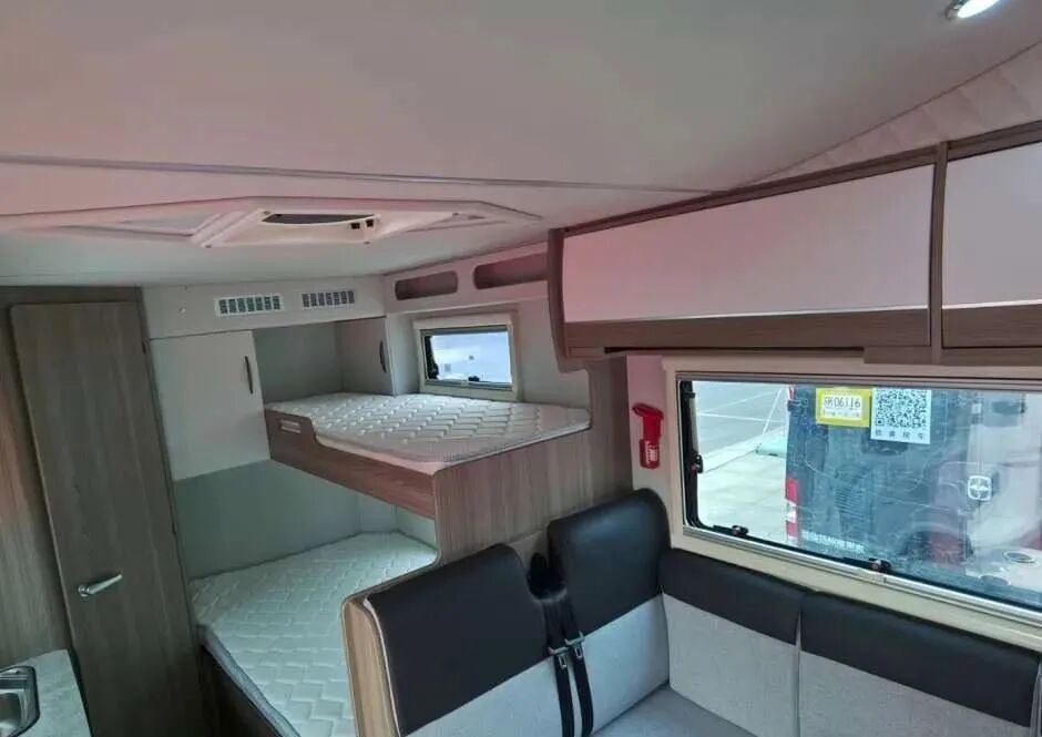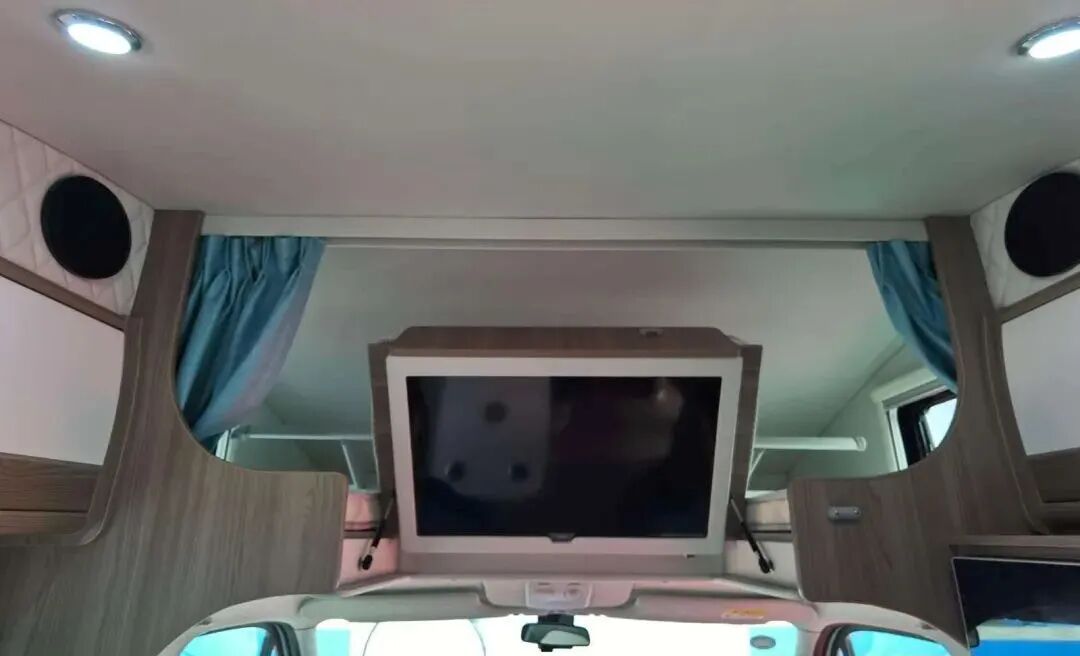 额头床位于驾驶室正上方,尺寸为2100*1250mm,可容下双人睡卧。床的外侧配备有隐私帘,可营造良好的睡眠空间。除此之外,床的两侧还各设计有一扇外推窗,便利日常的通风采光。床的下方则嵌入一台32寸网络电视,翻折式设计,刚好面对会客区,搭配上车内的音响实用,日常观影惬意舒适。