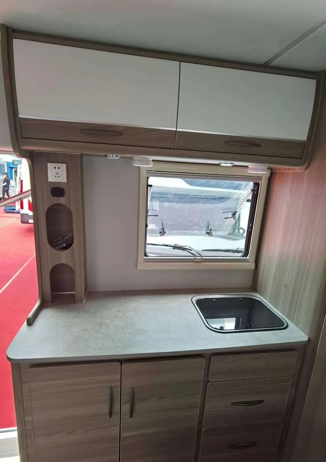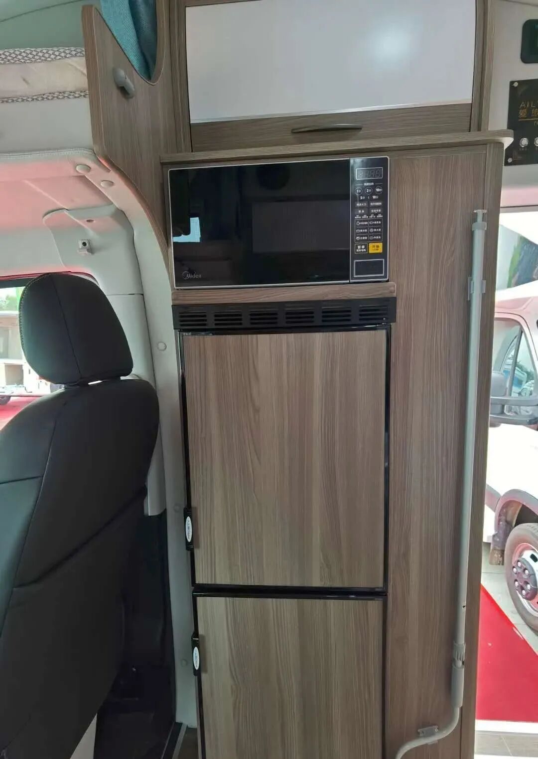 会客区对面为整车的内部厨房区,由中门进行分隔分为左右两个区域:车门左侧是厨房的家电区,配备了一台138L双开门冰箱和微波炉,在微波炉的上方还有一个储物柜。车门右侧主要为操作区域,配备带盖板不锈钢水槽、隐藏式水龙头、五孔电源插座、烟雾报警器、收纳抽屉、储物柜和吊柜等,日常做饭的话可以和户外厨房配合,不想下车做饭的话也可以装配一个电磁炉。