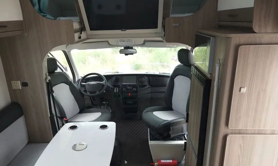 驾驶室沿用了大通原厂设计,内部空间和视野各方面都较为舒适。此外,驾驶室的正副驾驶座椅均均支持向后旋转。