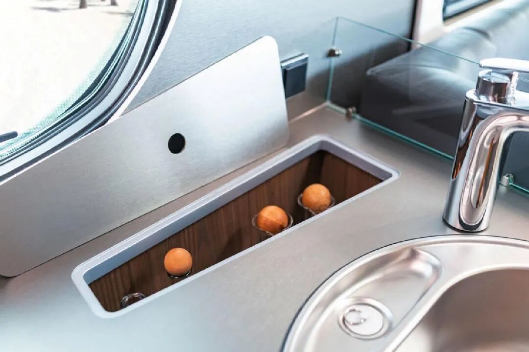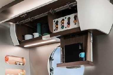 厨房区除了配置超宽超深的抽屉以外,内部还附加了一个储物柜,再加上顶部的储物柜,为厨房提供充足的存储空间;此外,如果你平时喜欢喝咖啡的话,厨房顶部还配有隐藏集成式咖啡机升降架,平时隐藏在储物柜内部,需要时可以拉出;标准配置中还包含了可容纳14粒胶囊的专属储存架。