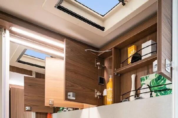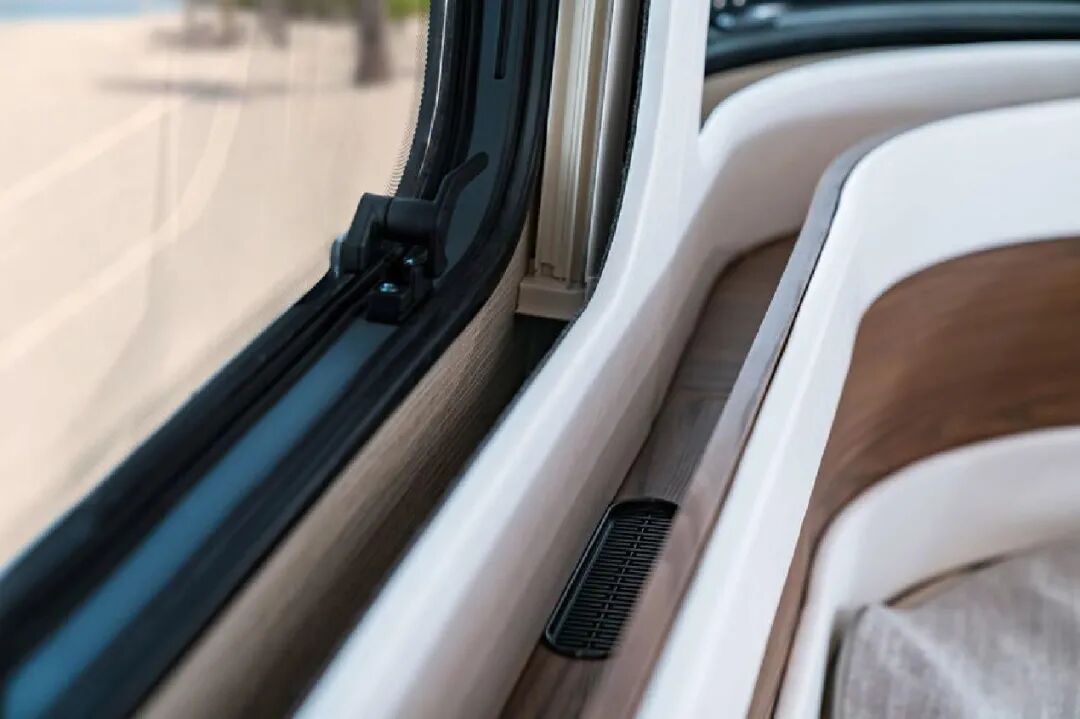 该款房车的车窗全部装有百褶窗,睡觉或休息时可拉下使房车内部变暗,在营造良好的休息氛围的同时,加强隐私保护;