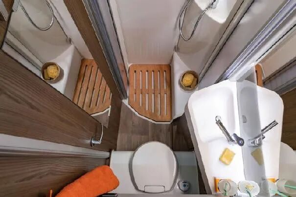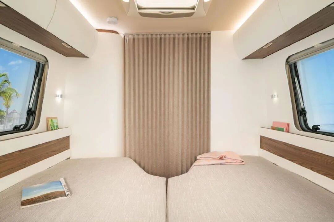 休息区位于房车尾部,宽阔的双人床采用V型设计,结合了单人床、双人床的优点,在出入更加方便的同时,更大的睡眠区域睡起觉来也是格外的舒适;此外,休息区还被全景车窗与顶置大天窗所包裹,视野更开阔,采光更充足的同时,百褶窗的设计也极大的保障了私人空间不被打扰;