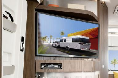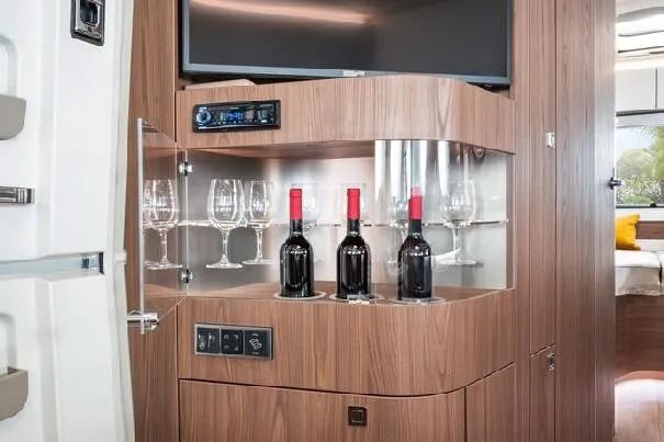厨房区对面配置了带有照明的酒吧隔间(位于入门处),可放置多瓶红酒以及足够使用的红酒杯;上方可选配多媒体组件,包含一台32英寸的电视机、DAB+收音机、DSP盒以及数字卫星天线,驻车休息时用来娱乐是个不错的选择;