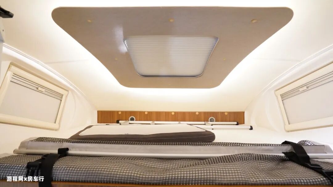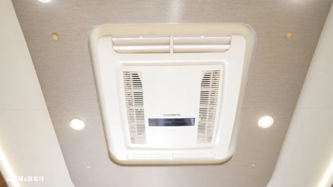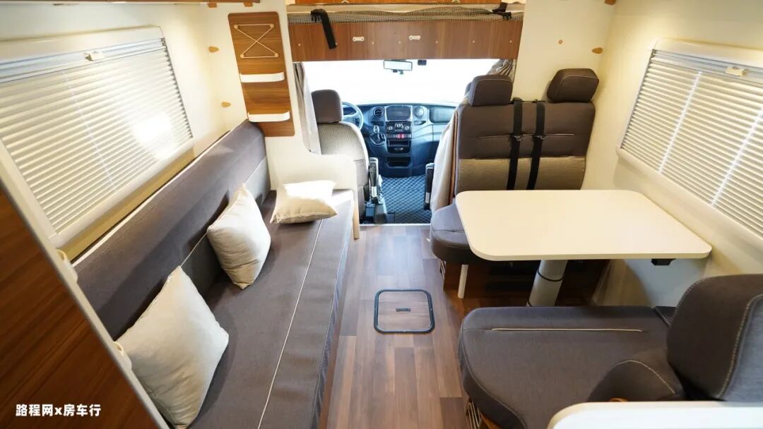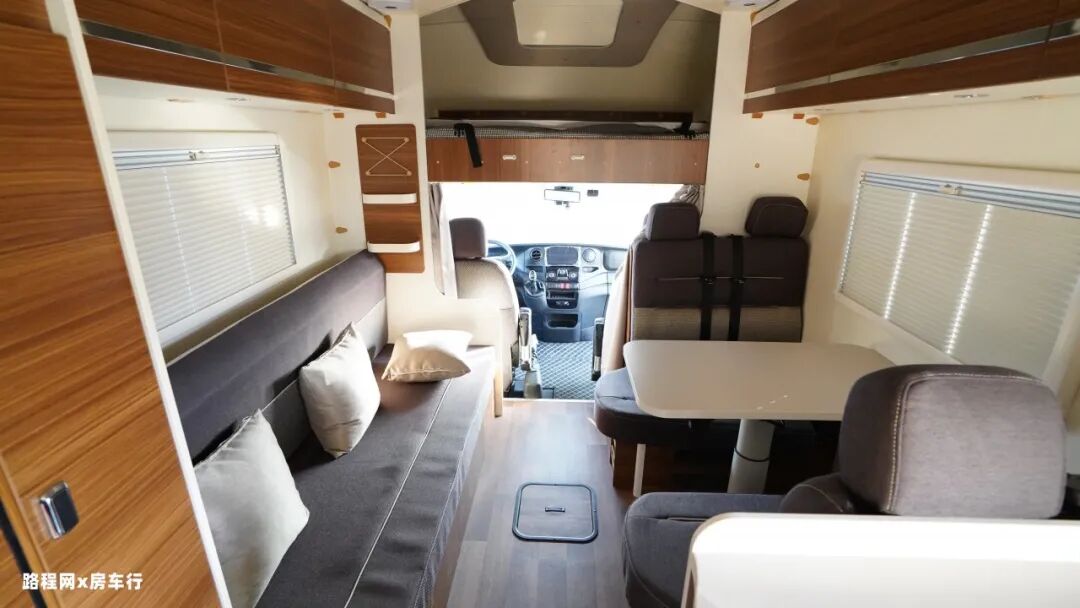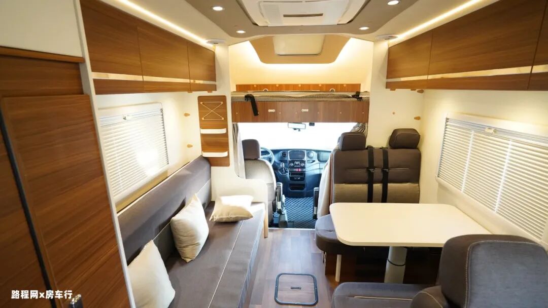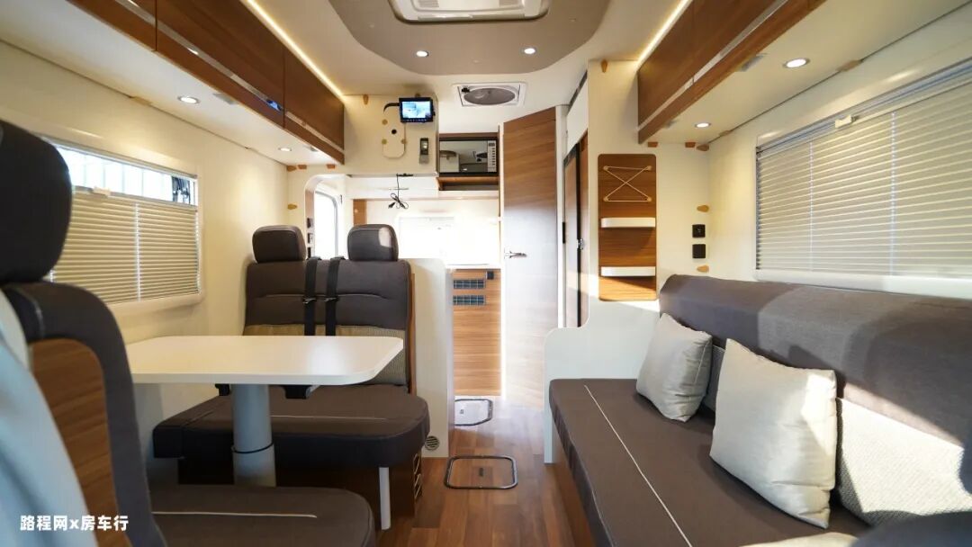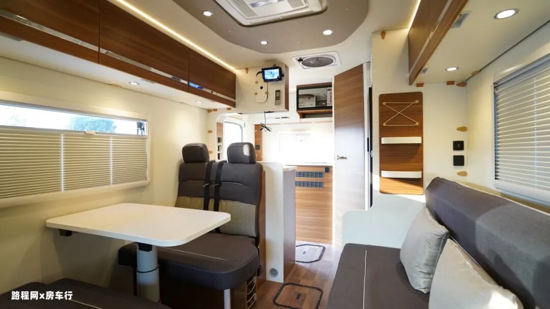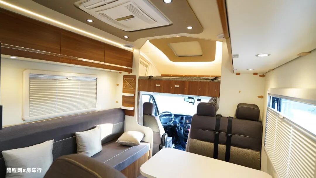 车厢中部是房车的休息区,配有四人对坐卡座沙发和侧长条沙发床系统,车厢顶部是超静音双转子顶置空调,制冷更高效。