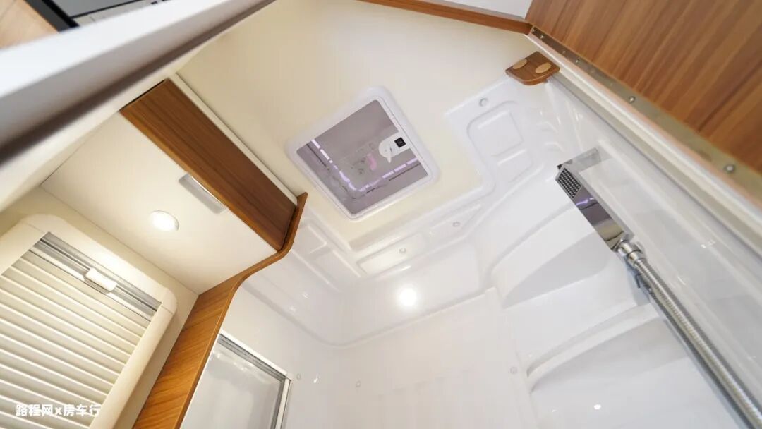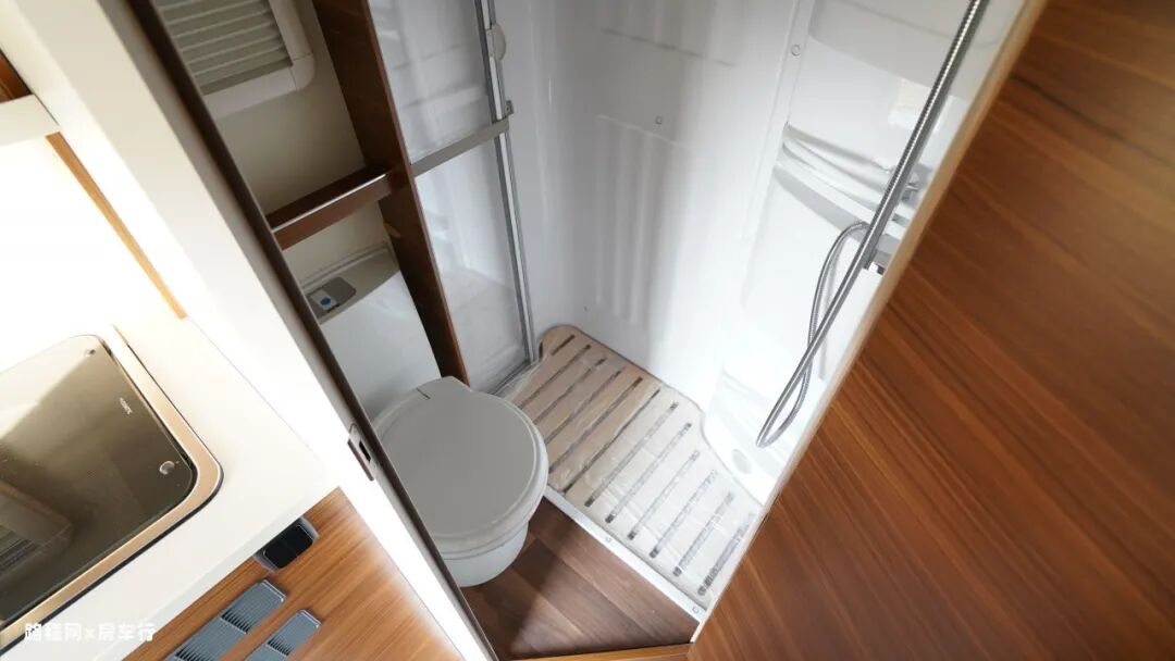 厨房旁边是该车的卫生间,尽管隆翠3号房车为无拓展的设计,但卫生间内部依然可通过亚克力板来实现干湿分离。