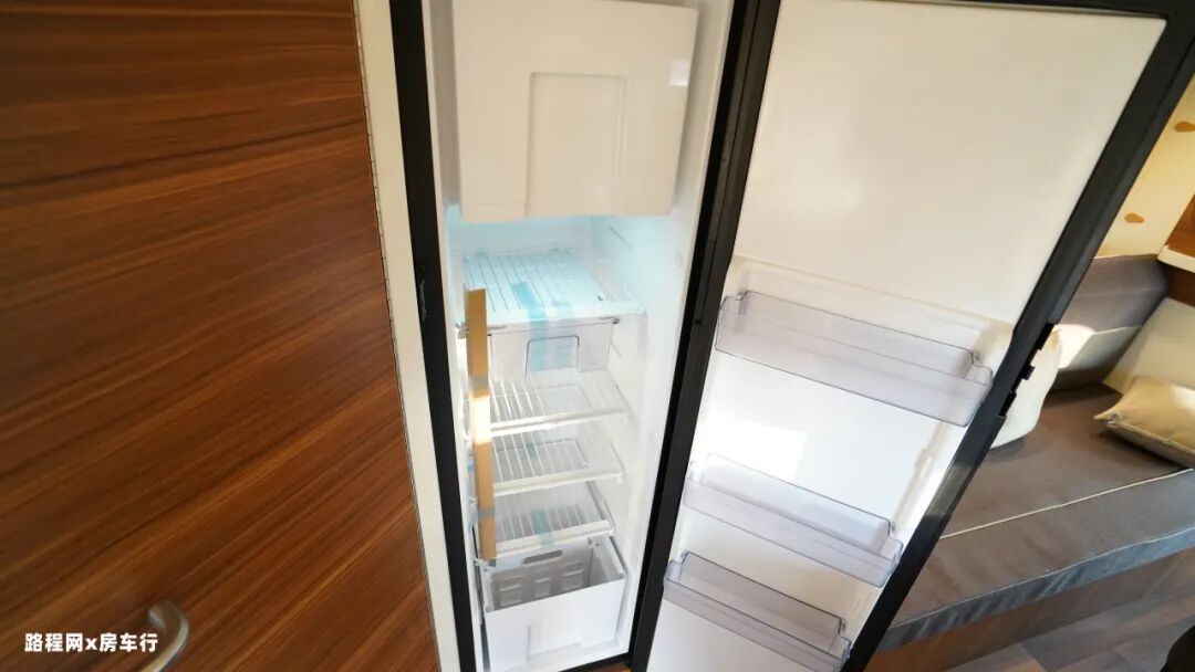 再往旁边看是该车的152L进口冰箱,容量大,可存放的食材和饮品是可观的。冰箱上方和旁边都是储物空间,旁边的立式储物柜挂置大衣比较方便。