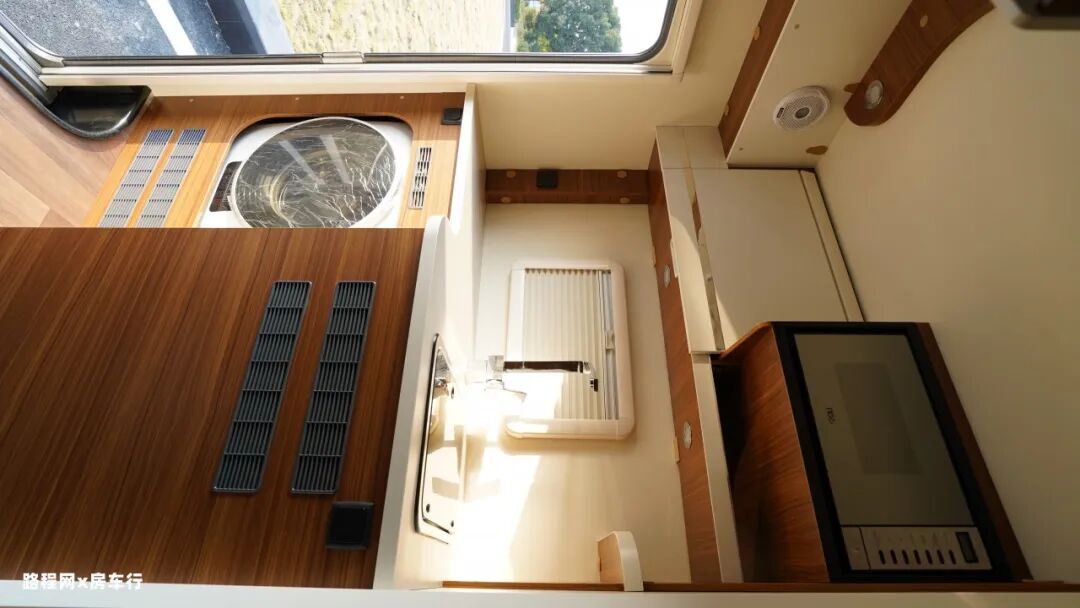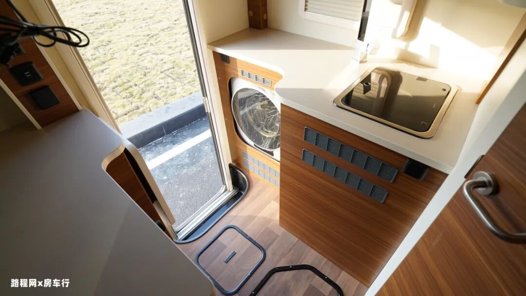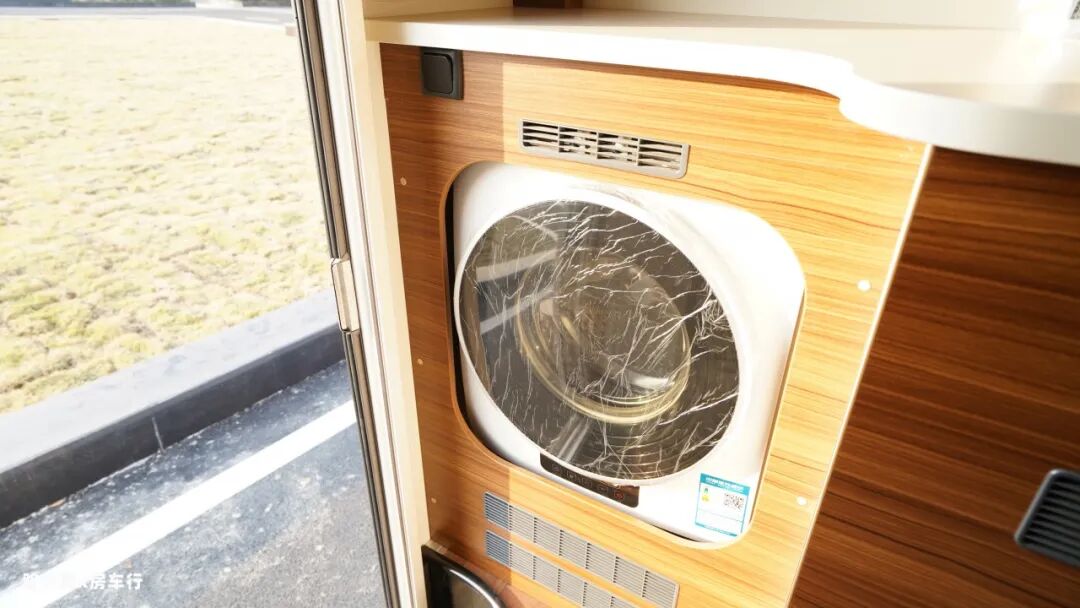 车尾门处是房车的厨房区,厨房操作台下方配有3Kg滚筒式洗衣机,洗衣机带高温杀菌和烘干功能,日常清洗小件衣物没问题。