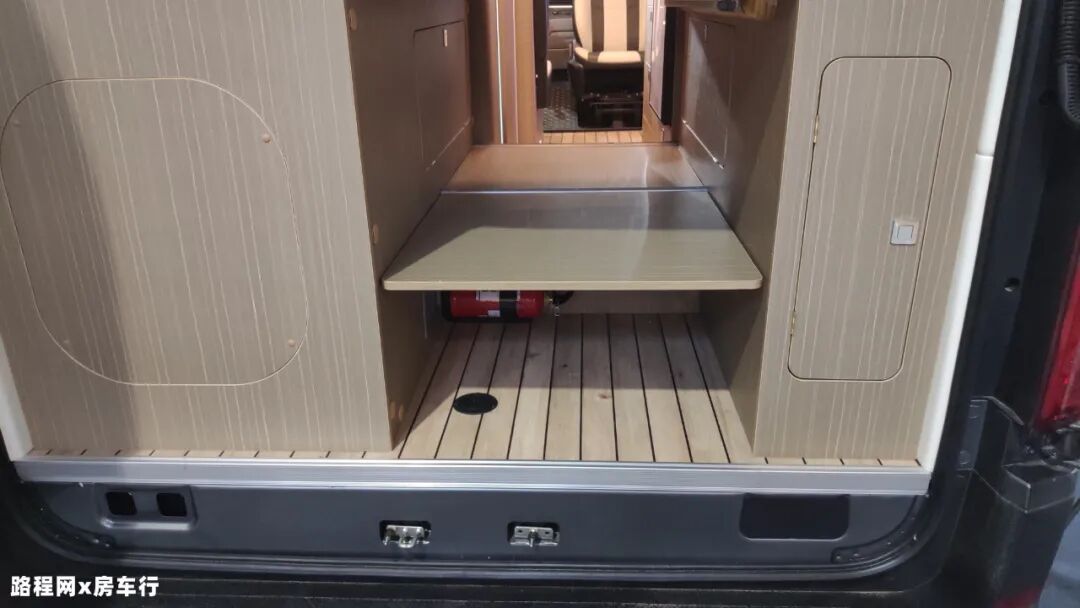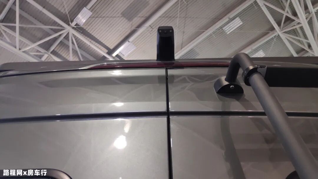 尾部采用对向外开门设计,并配有后爬梯与自行车车架方便旅居时使用;多组LED灯提升车辆夜间行车的辨识度;顶部中间设有倒车雷达;