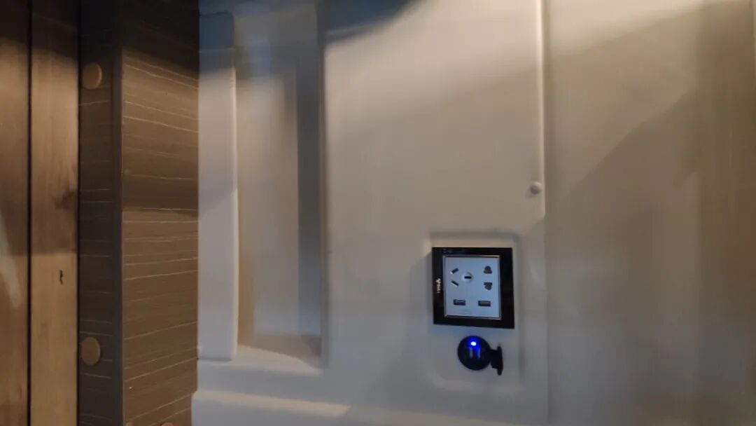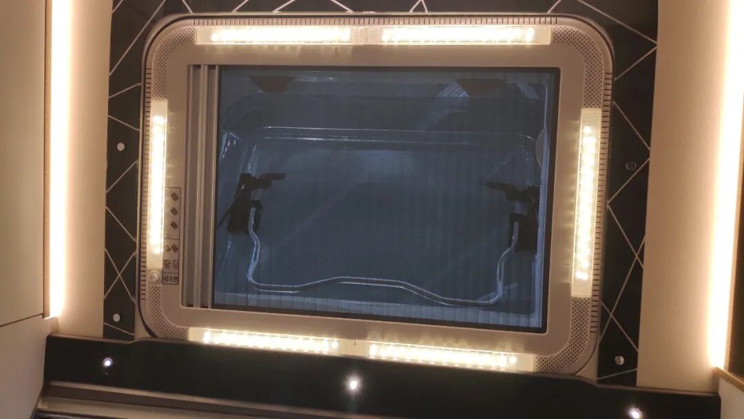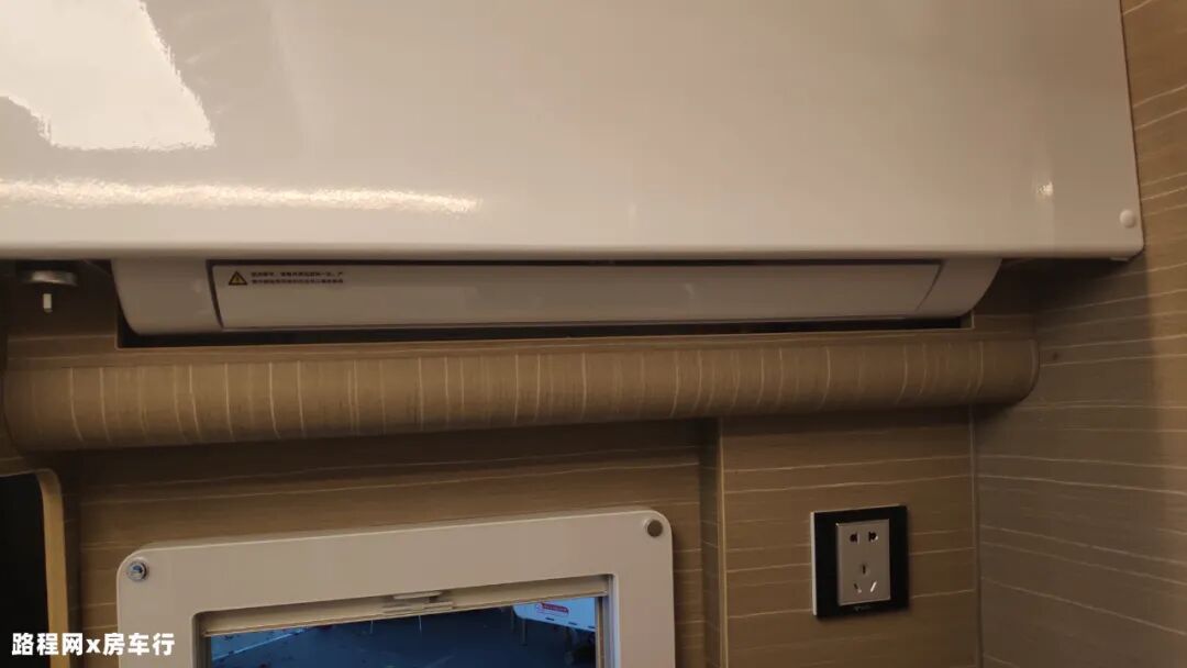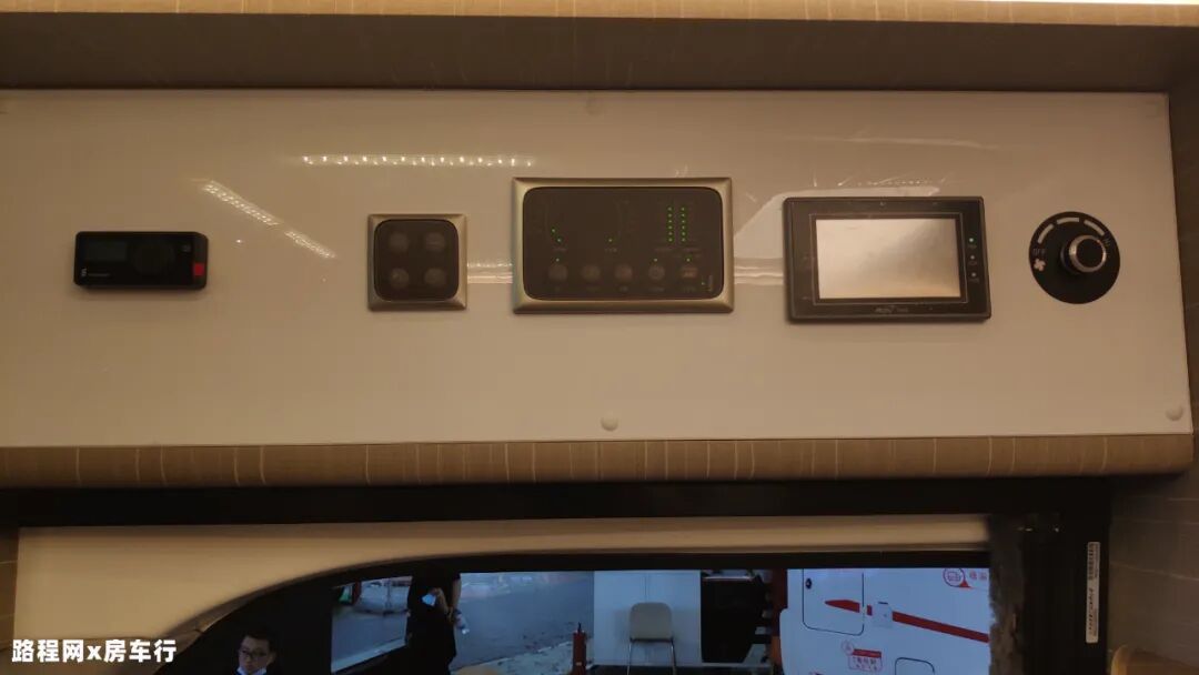 左侧乘客门上方是车内的水电集成控制区域,可通过这里观察并控制上的水路、电器;制冷方面车内配置了一台12V直流空调,无需逆变器,可直接使用;供暖配有埃贝赫燃油暖风热水一体机(5KW),充分满足日常生活所需;